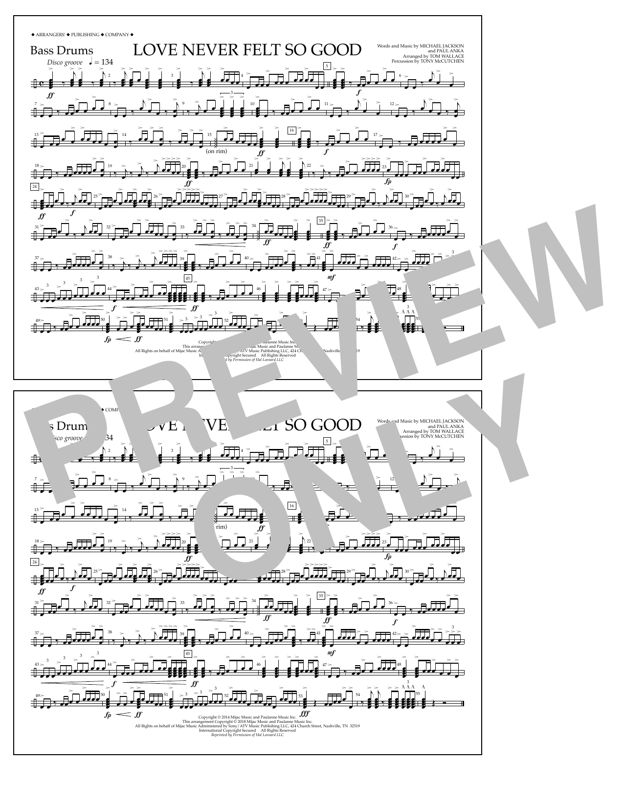 Download or print Tom Wallace Love Never Felt So Good - Bass Drums sheet music, chords and digital score arranged for Marching Band. This Pop score includes 1 page(s).