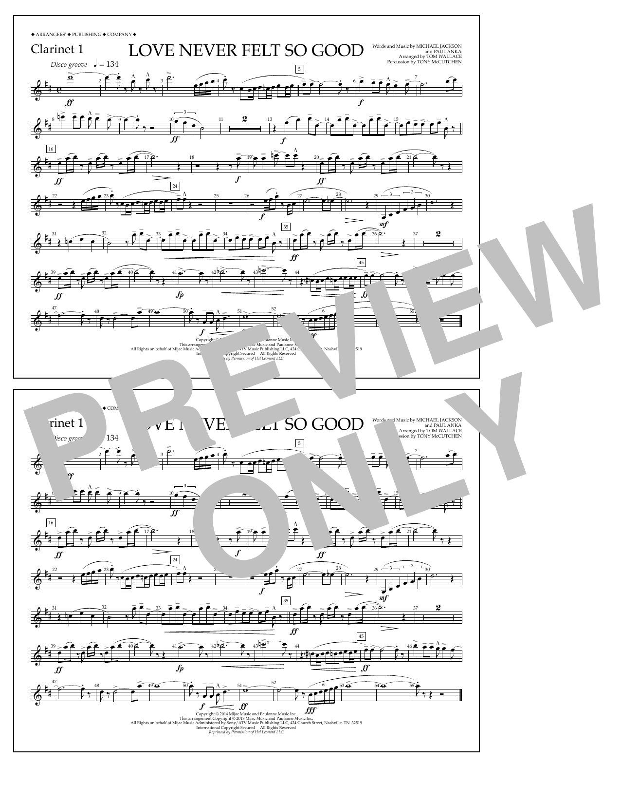 Download or print Tom Wallace Love Never Felt So Good - Clarinet 1 sheet music, chords and digital score arranged for Marching Band. This Pop score includes 1 page(s).