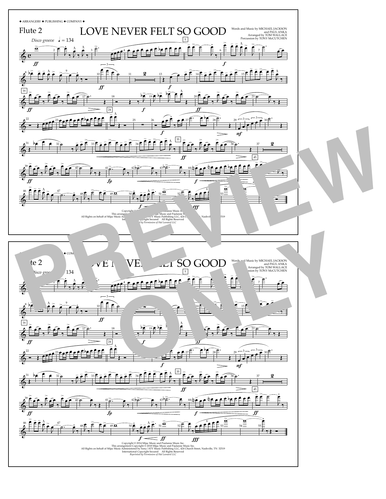 Download or print Tom Wallace Love Never Felt So Good - Flute 2 sheet music, chords and digital score arranged for Marching Band. This Pop score includes 1 page(s).