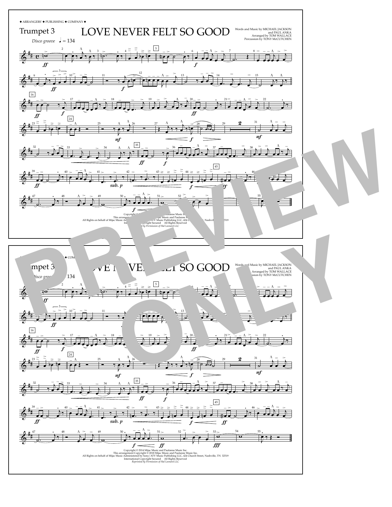 Download or print Tom Wallace Love Never Felt So Good - Trumpet 3 sheet music, chords and digital score arranged for Marching Band. This Pop score includes 1 page(s).