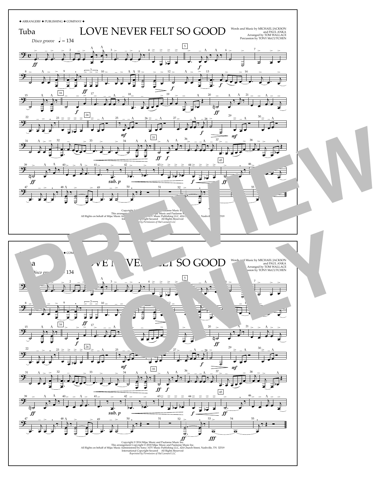 Download or print Tom Wallace Love Never Felt So Good - Tuba sheet music, chords and digital score arranged for Marching Band. This Pop score includes 1 page(s).