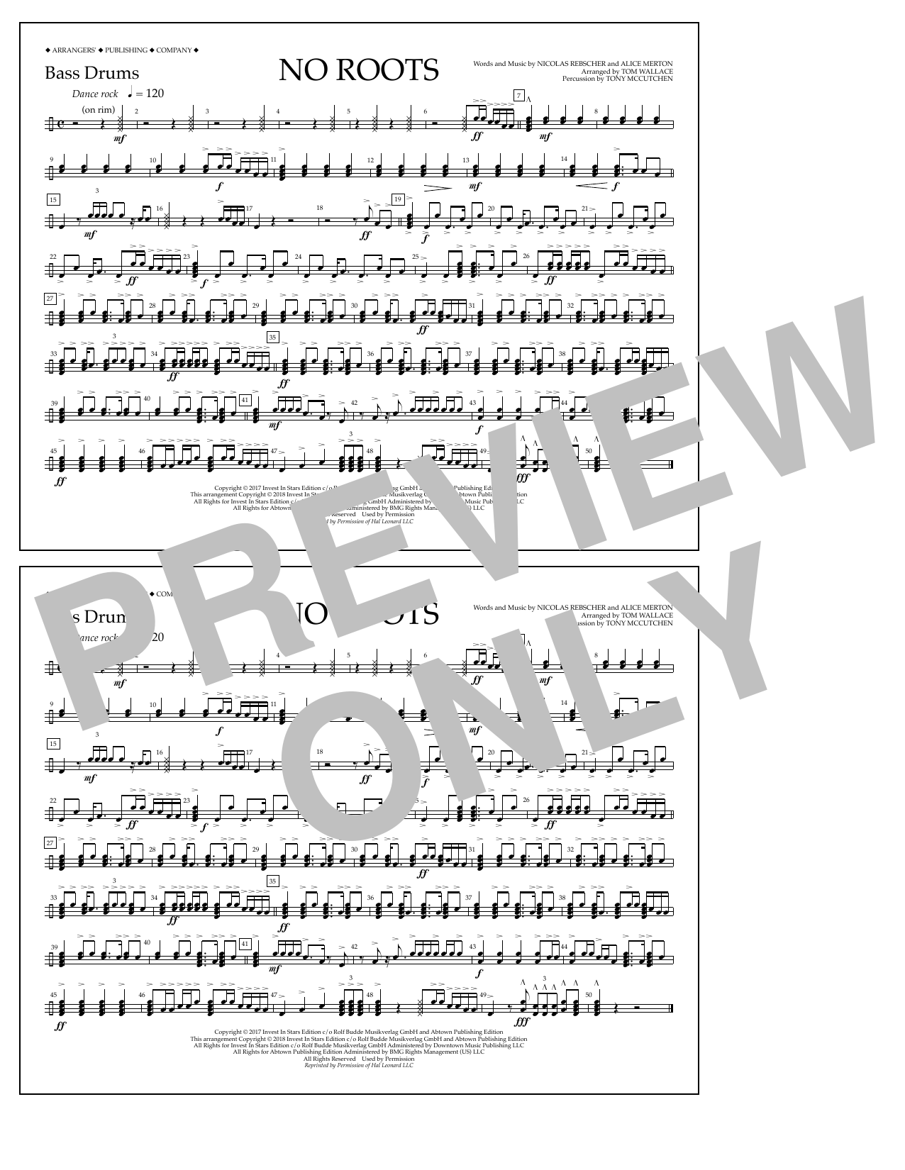 Download or print Tom Wallace No Roots - Bass Drums sheet music, chords and digital score arranged for Marching Band. This Pop score includes 1 page(s).
