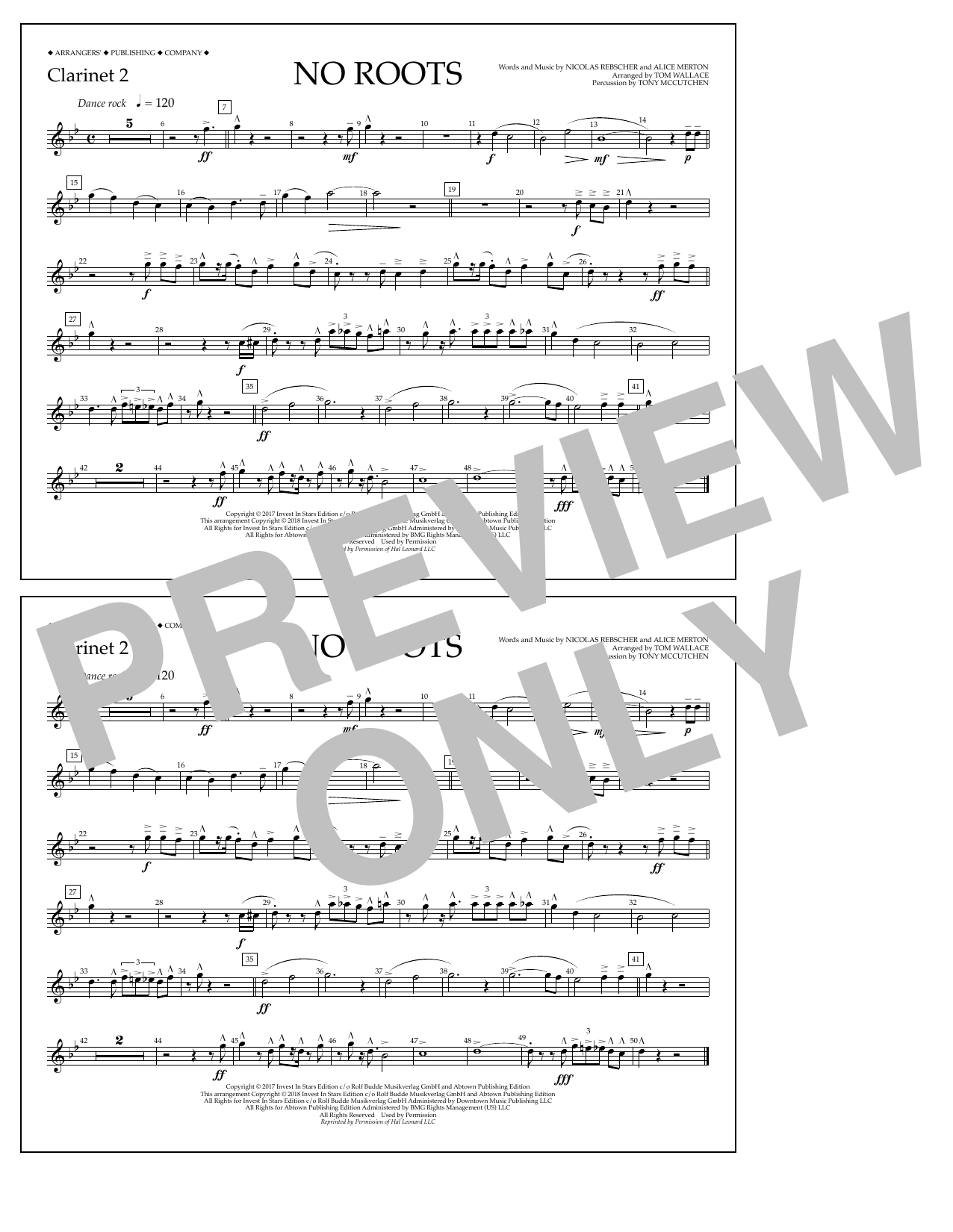 Download or print Tom Wallace No Roots - Clarinet 2 sheet music, chords and digital score arranged for Marching Band. This Pop score includes 1 page(s).