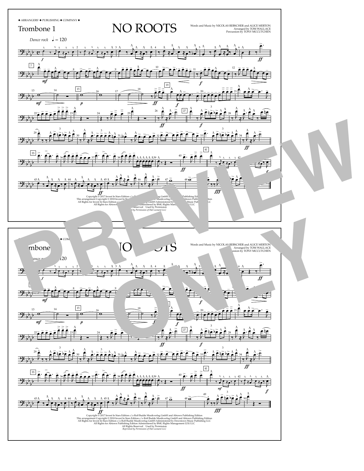 Download or print Tom Wallace No Roots - Trombone 1 sheet music, chords and digital score arranged for Marching Band. This Pop score includes 1 page(s).