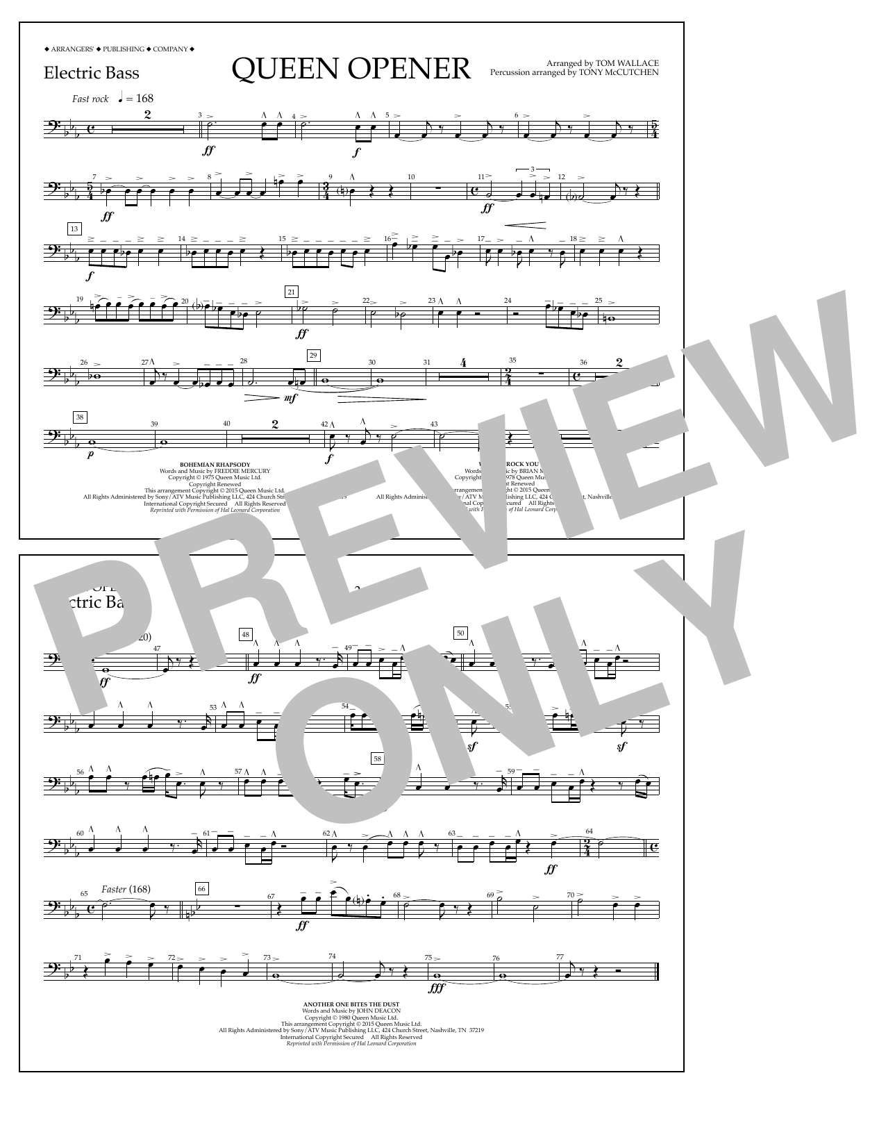 Download or print Tom Wallace Queen Opener - Electric Bass sheet music, chords and digital score arranged for Marching Band. This Pop score includes 1 page(s).