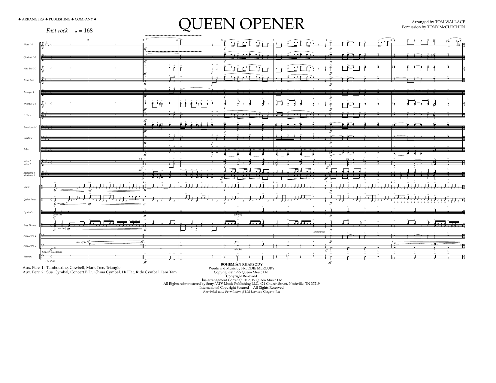 Download or print Tom Wallace Queen Opener - Full Score sheet music, chords and digital score arranged for Marching Band. This Pop score includes 10 page(s).