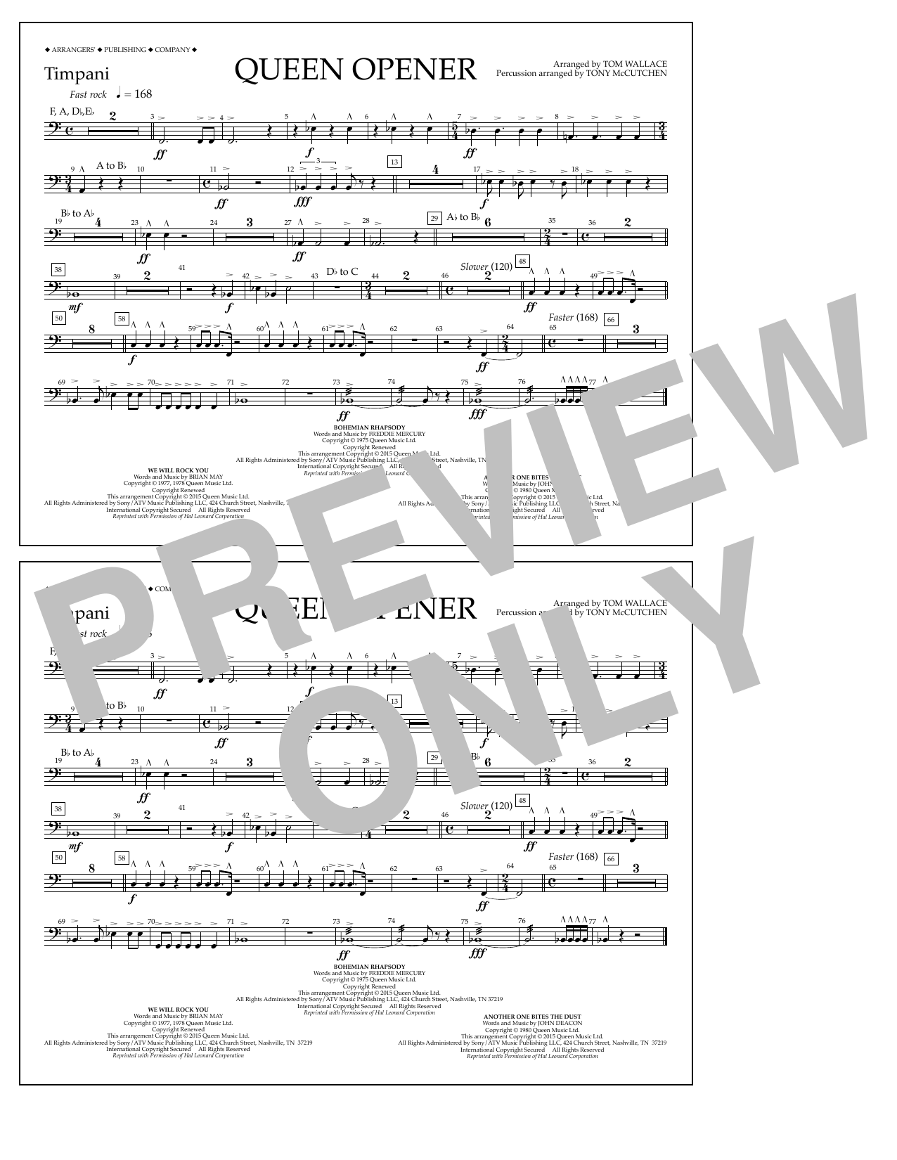 Download or print Tom Wallace Queen Opener - Timpani sheet music, chords and digital score arranged for Marching Band. This Pop score includes 1 page(s).