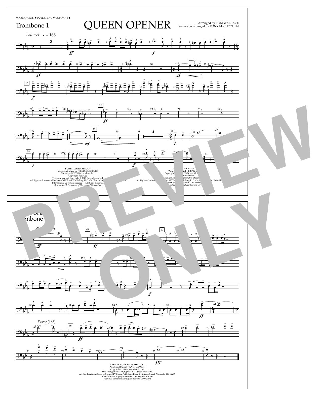 Download or print Tom Wallace Queen Opener - Trombone 1 sheet music, chords and digital score arranged for Marching Band. This Pop score includes 1 page(s).