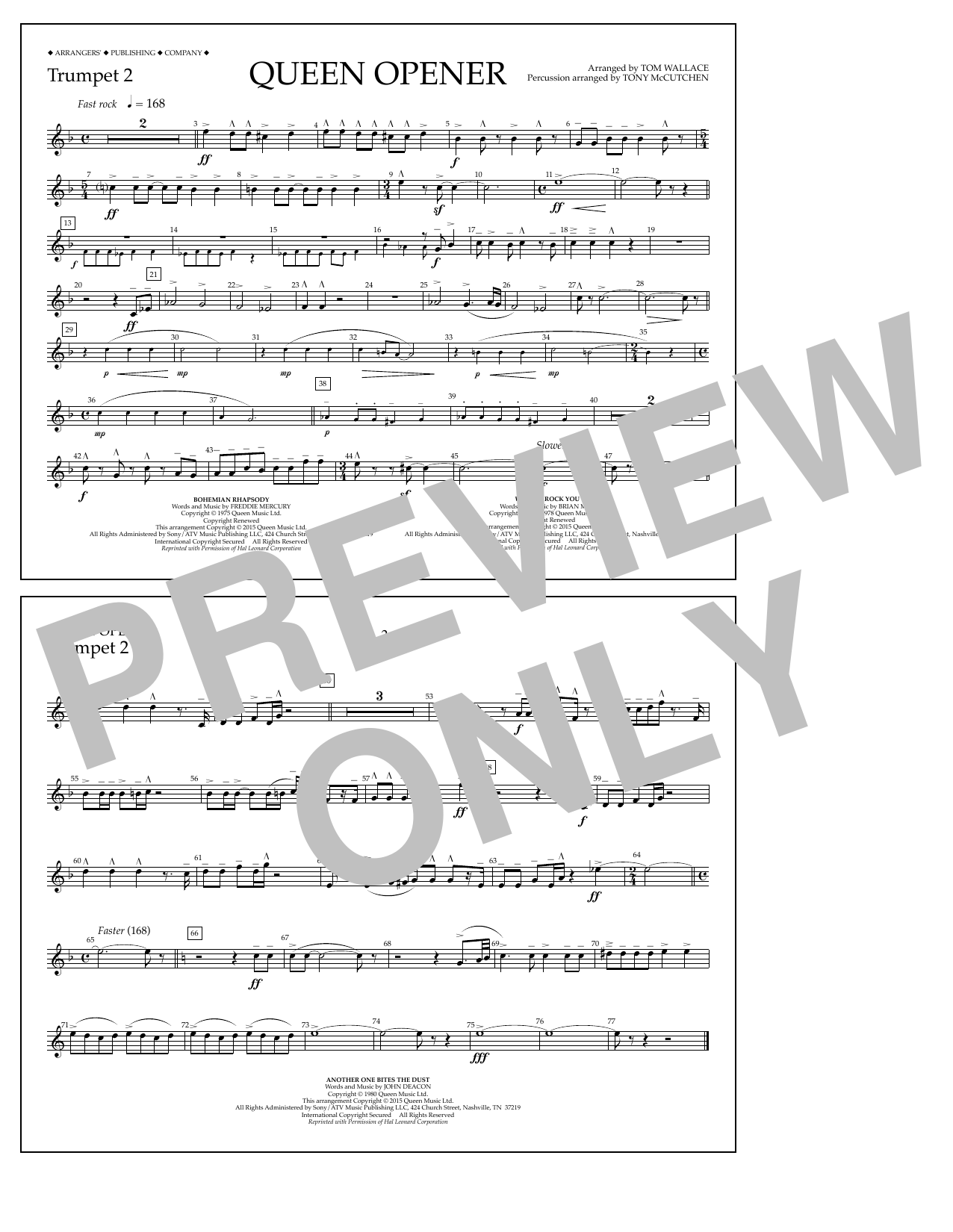 Download or print Tom Wallace Queen Opener - Trumpet 2 sheet music, chords and digital score arranged for Marching Band. This Pop score includes 1 page(s).