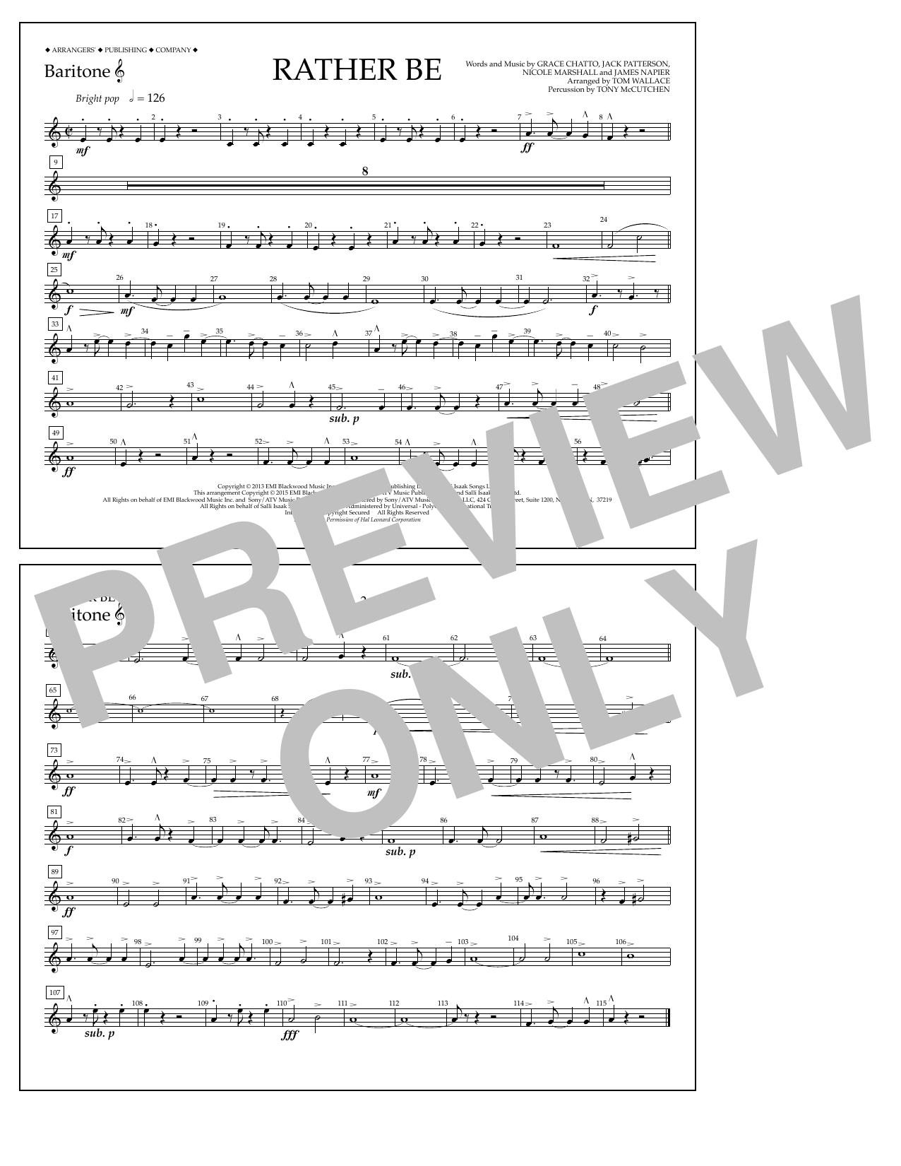 Download or print Tom Wallace Rather Be - Baritone T.C. sheet music, chords and digital score arranged for Marching Band. This Pop score includes 1 page(s).