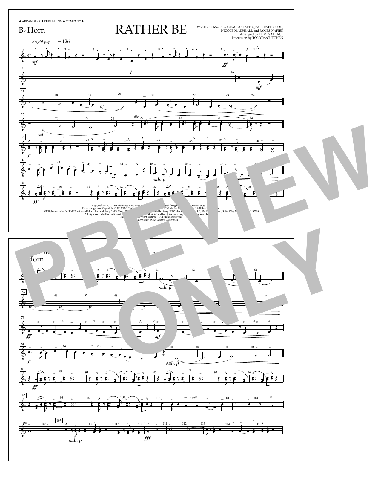 Download or print Tom Wallace Rather Be - Bb Horn sheet music, chords and digital score arranged for Marching Band. This Pop score includes 1 page(s).