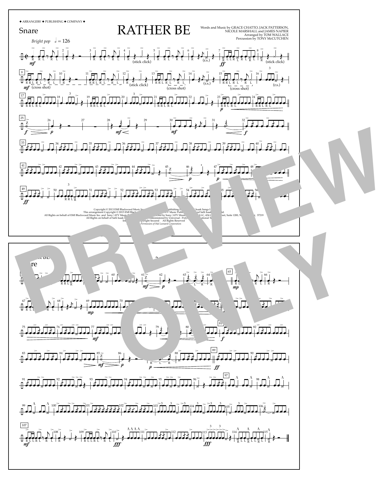 Download or print Tom Wallace Rather Be - Snare sheet music, chords and digital score arranged for Marching Band. This Pop score includes 1 page(s).