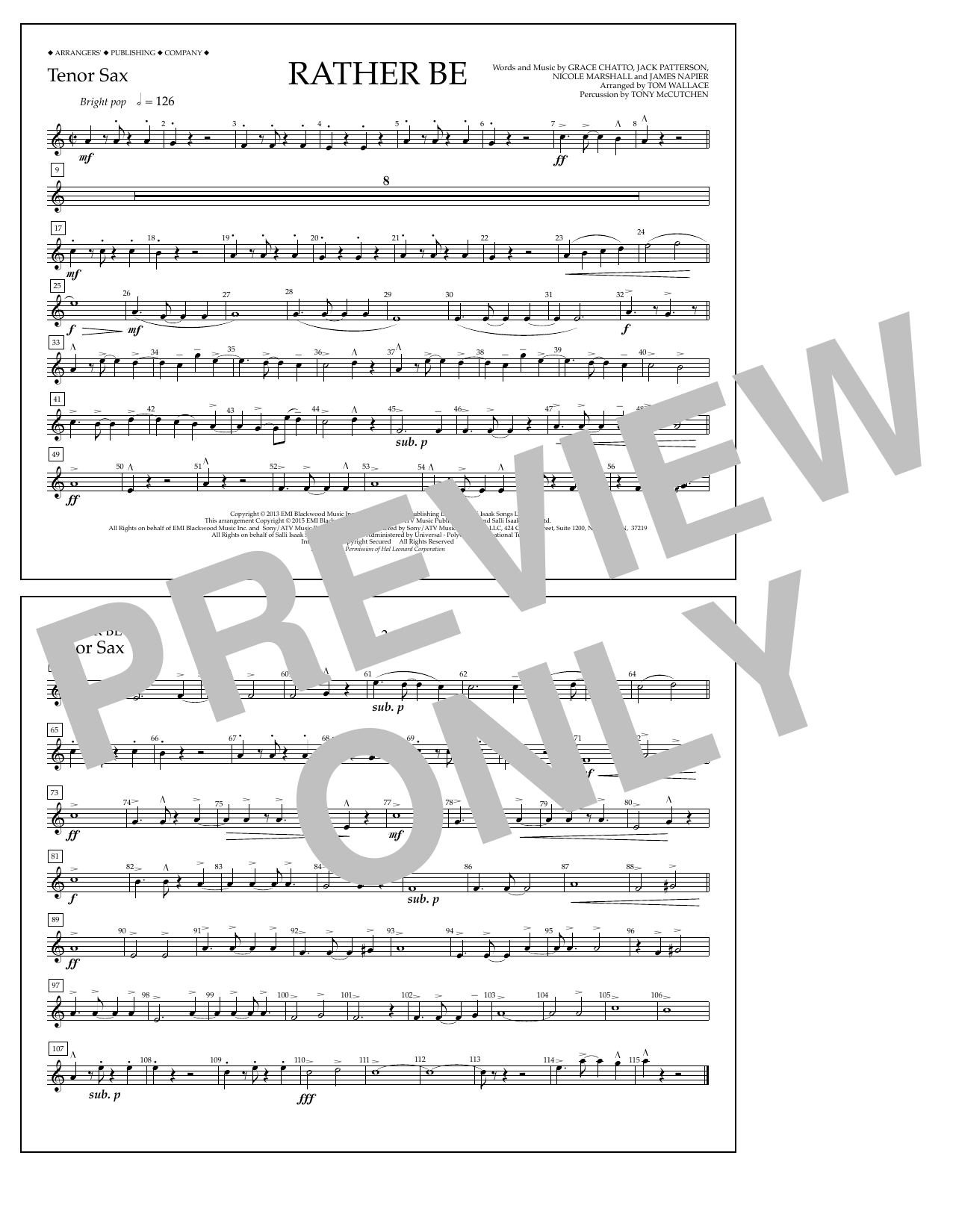 Download or print Tom Wallace Rather Be - Tenor Sax sheet music, chords and digital score arranged for Marching Band. This Pop score includes 1 page(s).