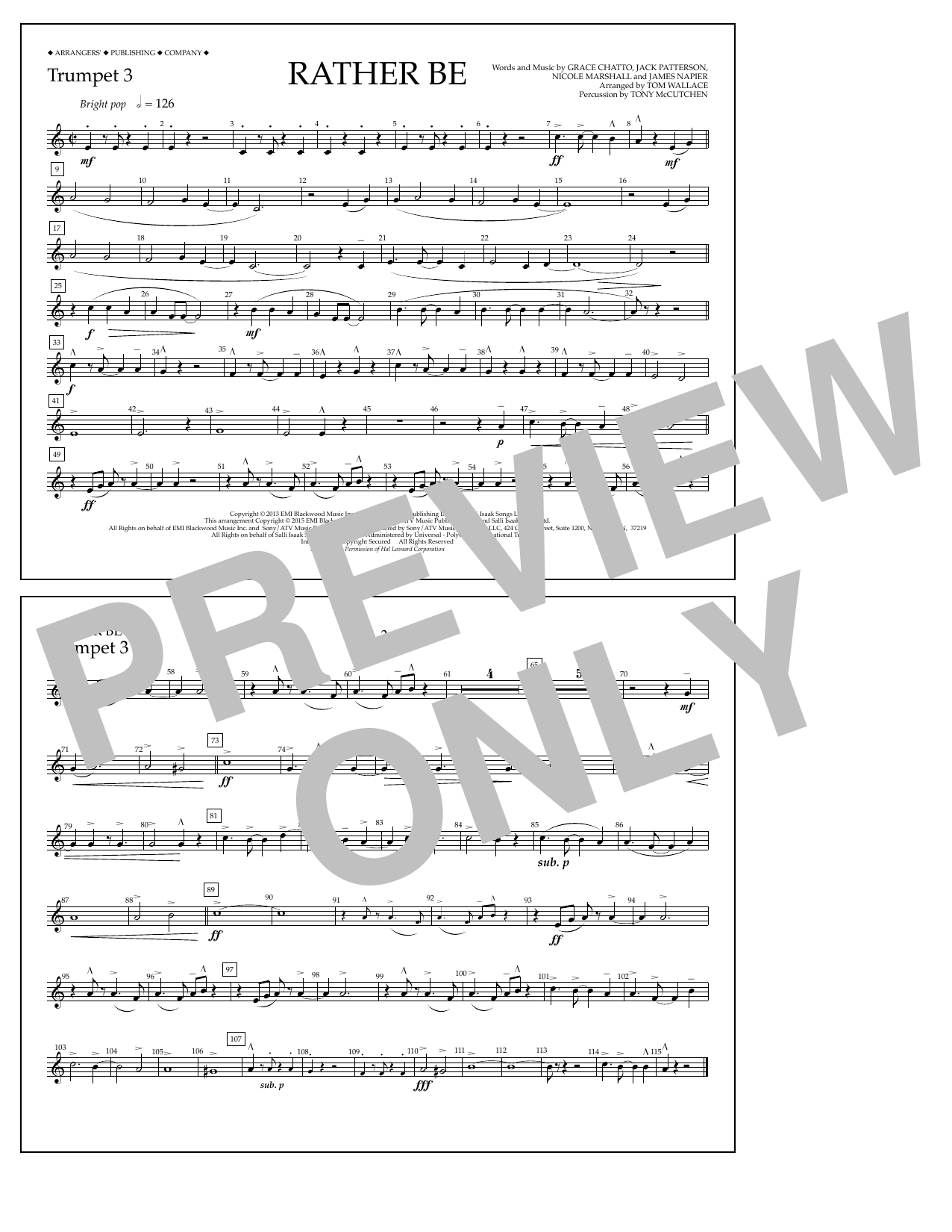 Download or print Tom Wallace Rather Be - Trumpet 3 sheet music, chords and digital score arranged for Marching Band. This Pop score includes 1 page(s).