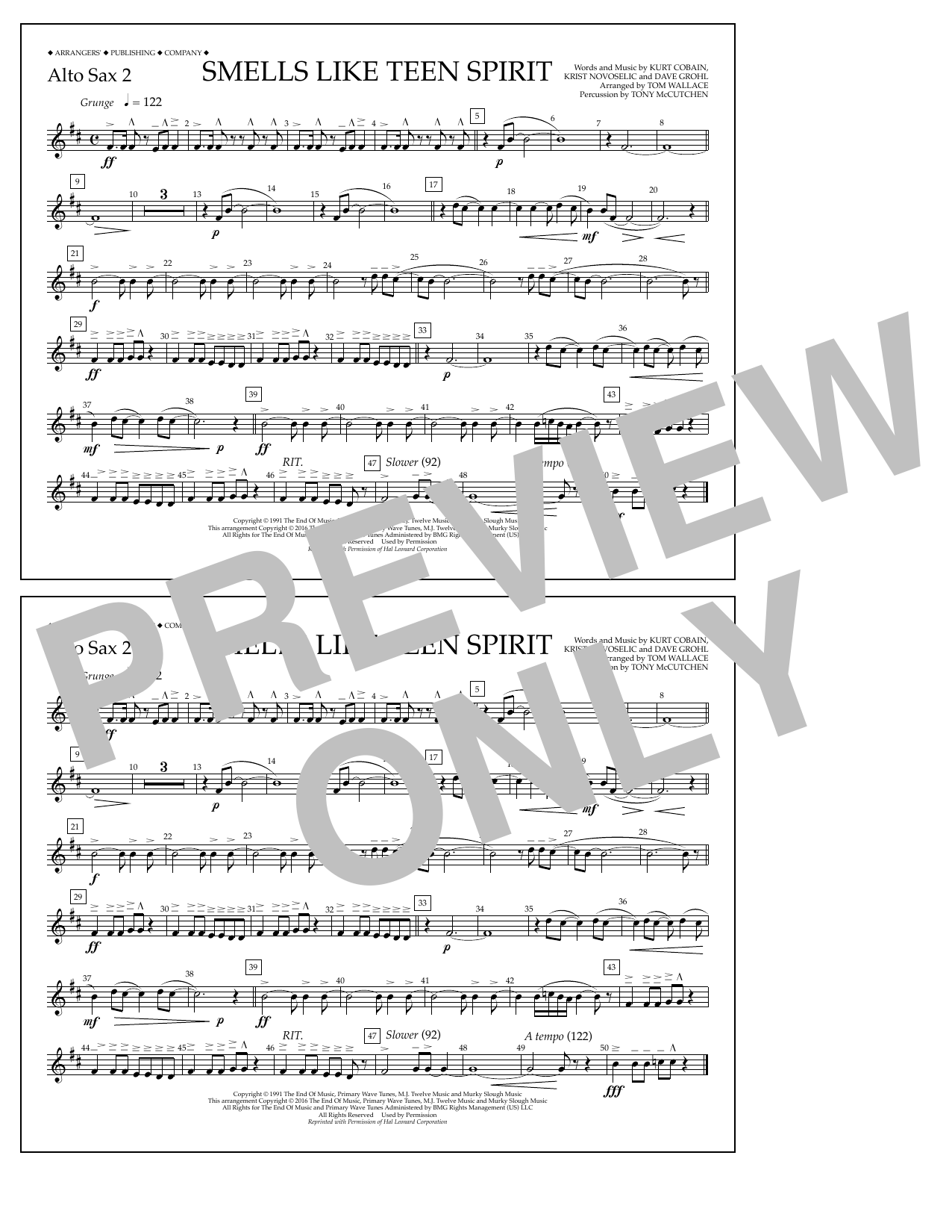 Download or print Tom Wallace Smells Like Teen Spirit - Alto Sax 2 sheet music, chords and digital score arranged for Marching Band. This Pop score includes 1 page(s).