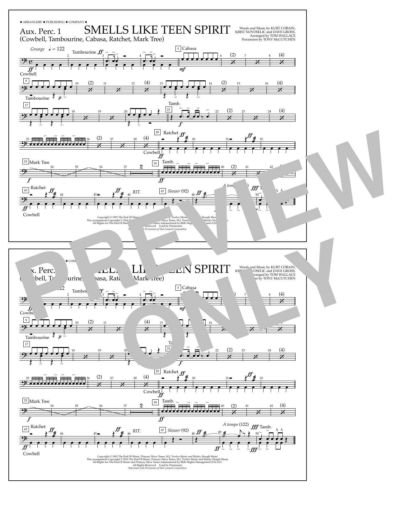 Download or print Tom Wallace Smells Like Teen Spirit - Aux. Perc. 1 sheet music, chords and digital score arranged for Marching Band. This Pop score includes 1 page(s).
