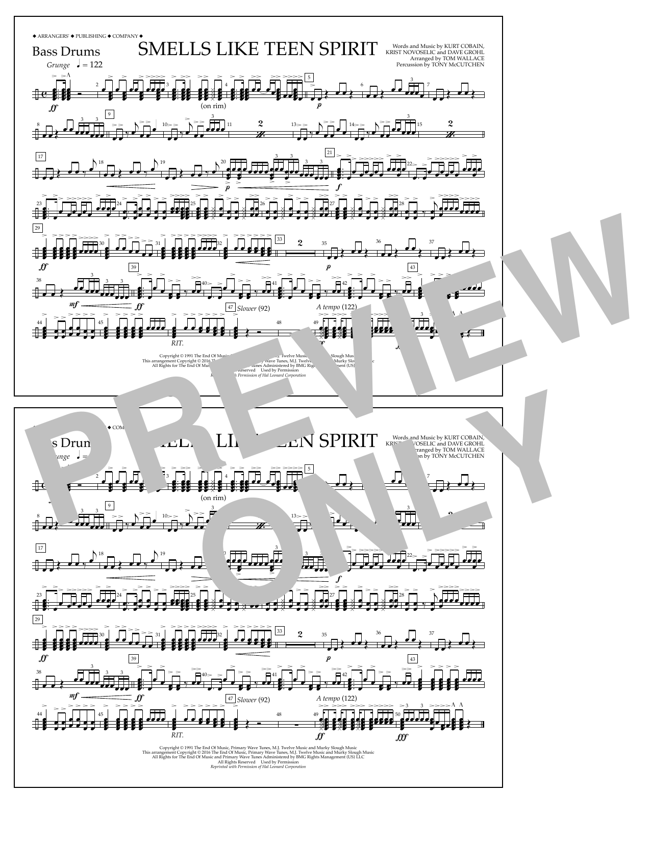 Download or print Tom Wallace Smells Like Teen Spirit - Bass Drums sheet music, chords and digital score arranged for Marching Band. This Pop score includes 1 page(s).