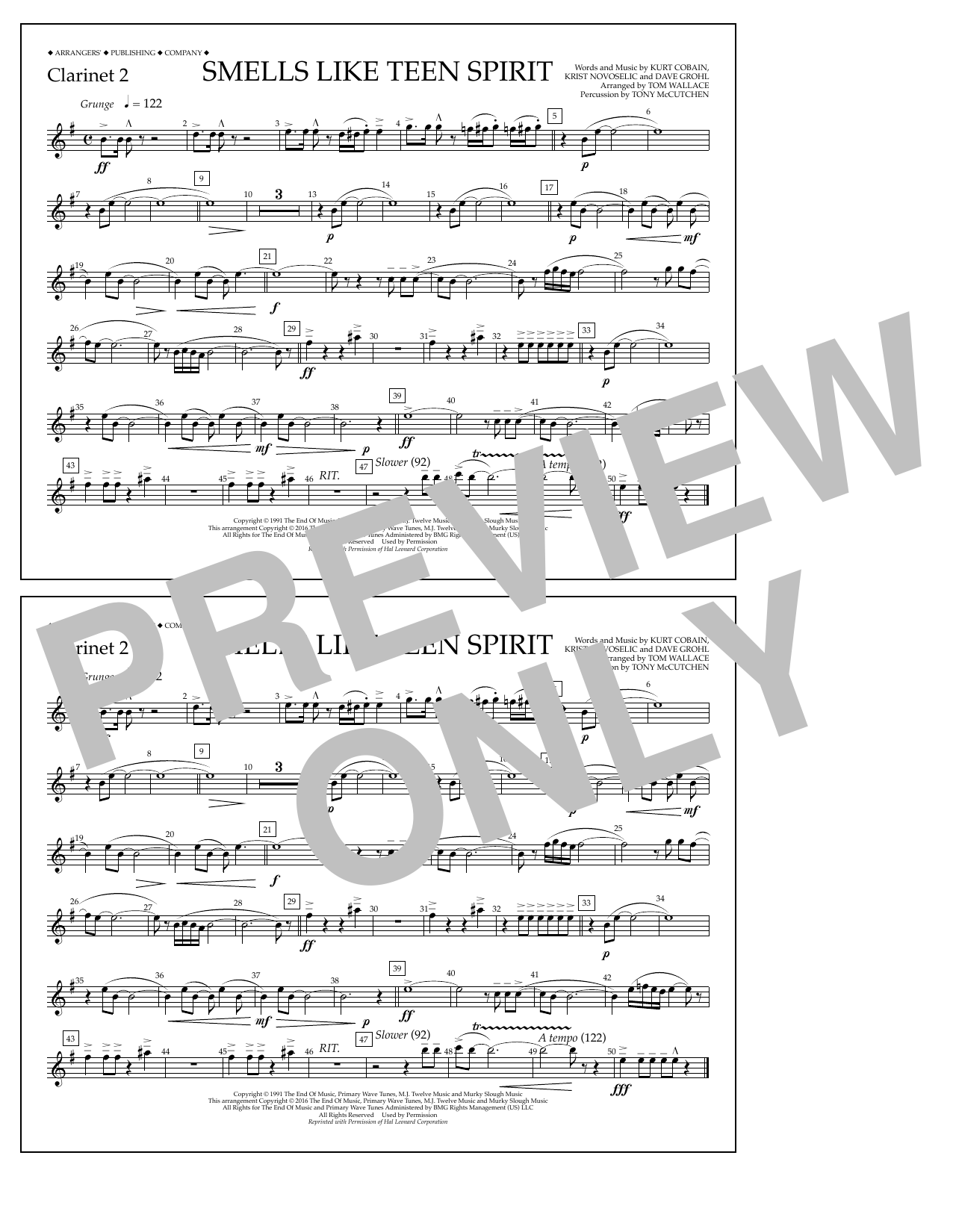 Download or print Tom Wallace Smells Like Teen Spirit - Clarinet 2 sheet music, chords and digital score arranged for Marching Band. This Pop score includes 1 page(s).