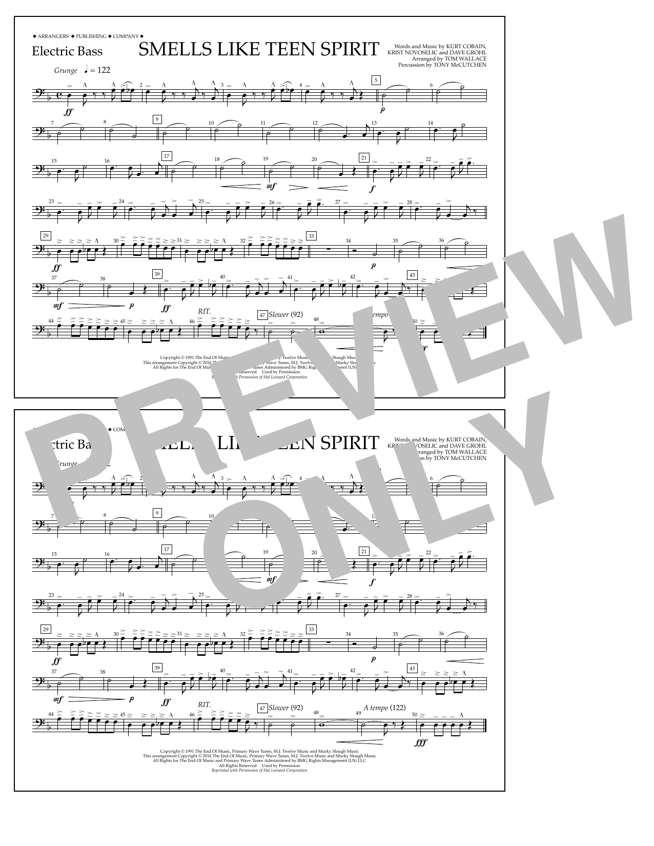 Download or print Tom Wallace Smells Like Teen Spirit - Electric Bass sheet music, chords and digital score arranged for Marching Band. This Pop score includes 1 page(s).