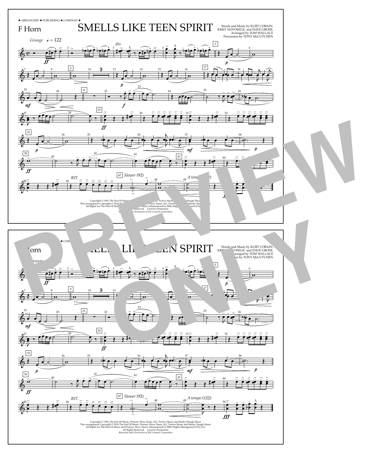 Download or print Tom Wallace Smells Like Teen Spirit - F Horn sheet music, chords and digital score arranged for Marching Band. This Pop score includes 1 page(s).