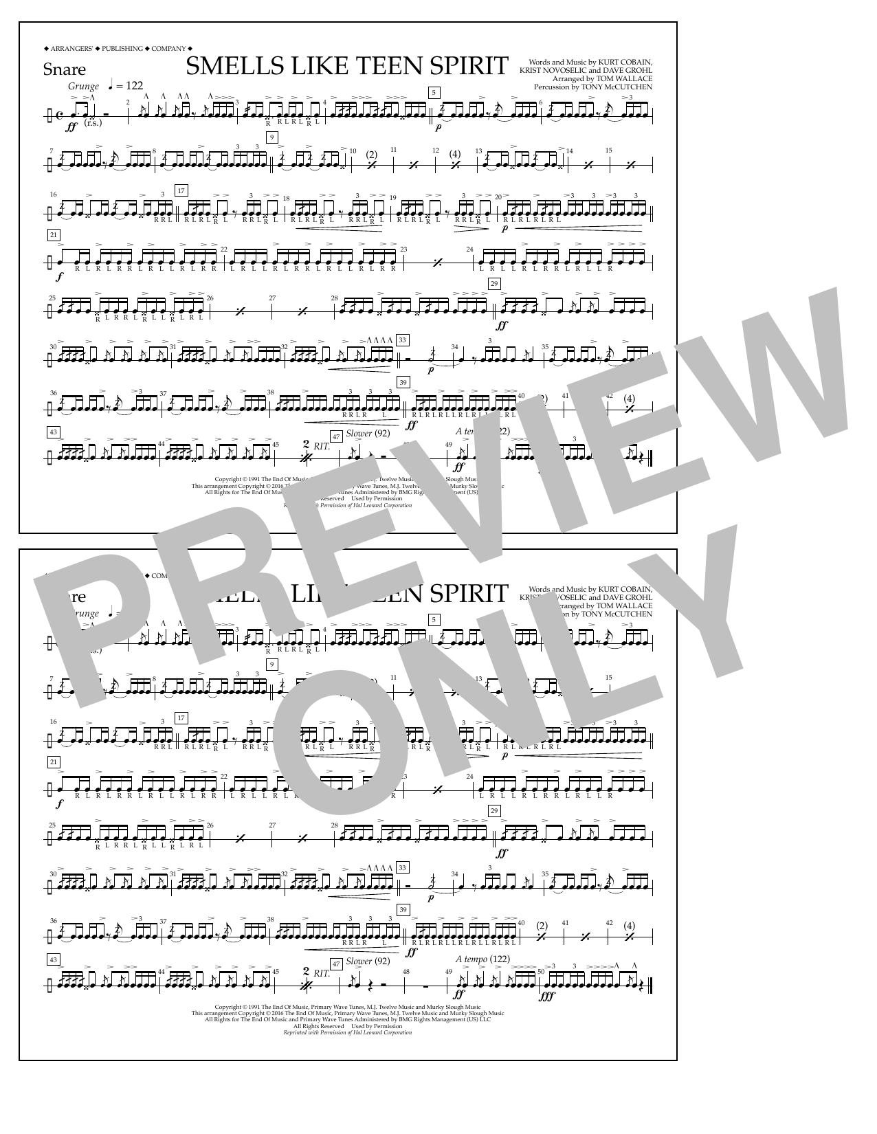 Download or print Tom Wallace Smells Like Teen Spirit - Snare sheet music, chords and digital score arranged for Marching Band. This Pop score includes 1 page(s).