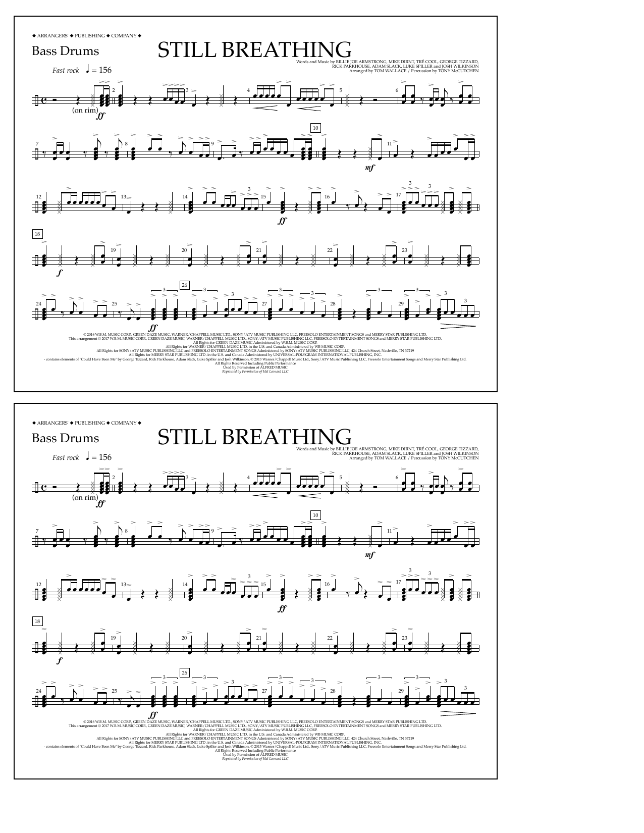 Download or print Tom Wallace Still Breathing - Bass Drums sheet music, chords and digital score arranged for Marching Band. This Pop score includes 2 page(s).