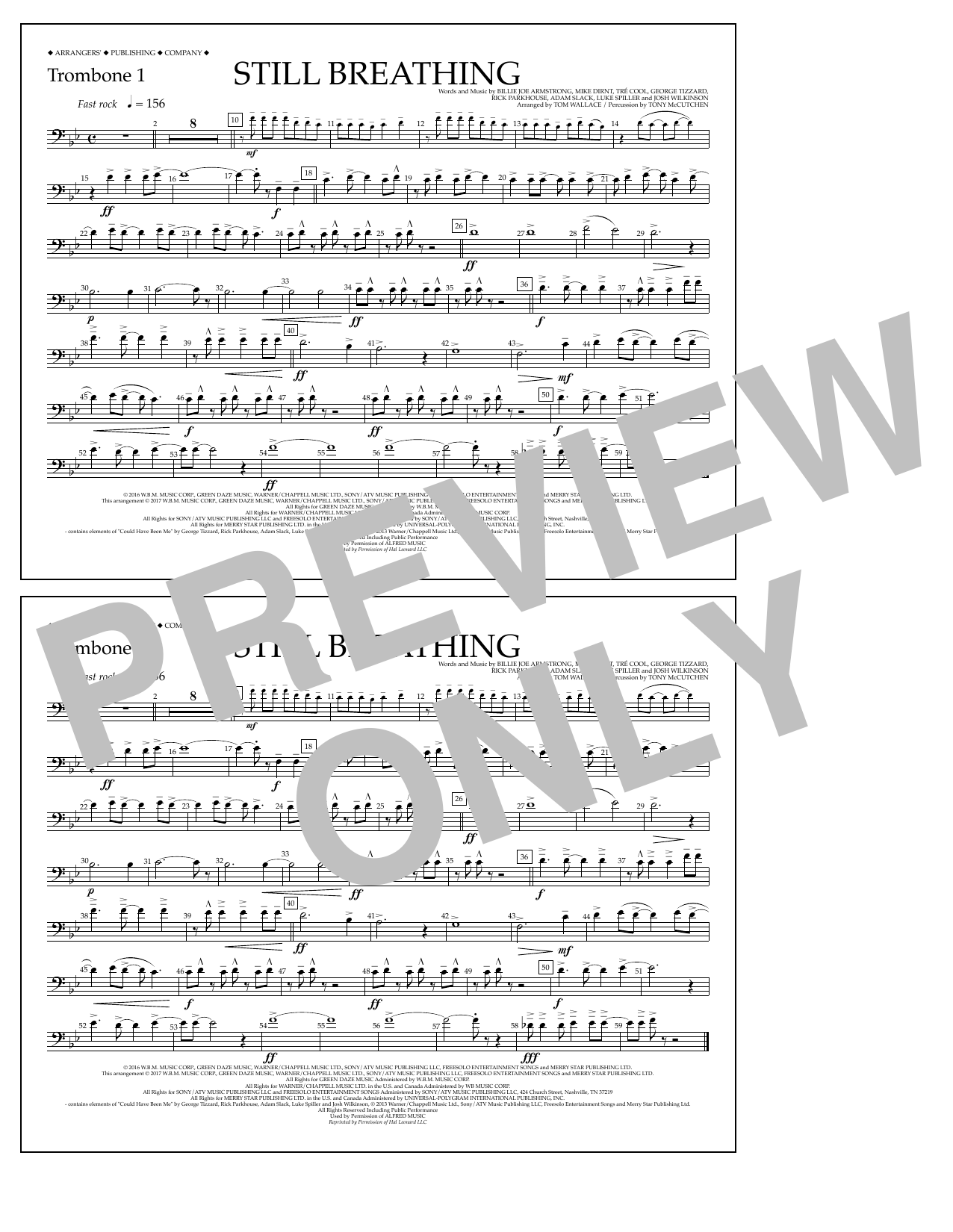 Download or print Tom Wallace Still Breathing - Trombone 1 sheet music, chords and digital score arranged for Marching Band. This Pop score includes 1 page(s).