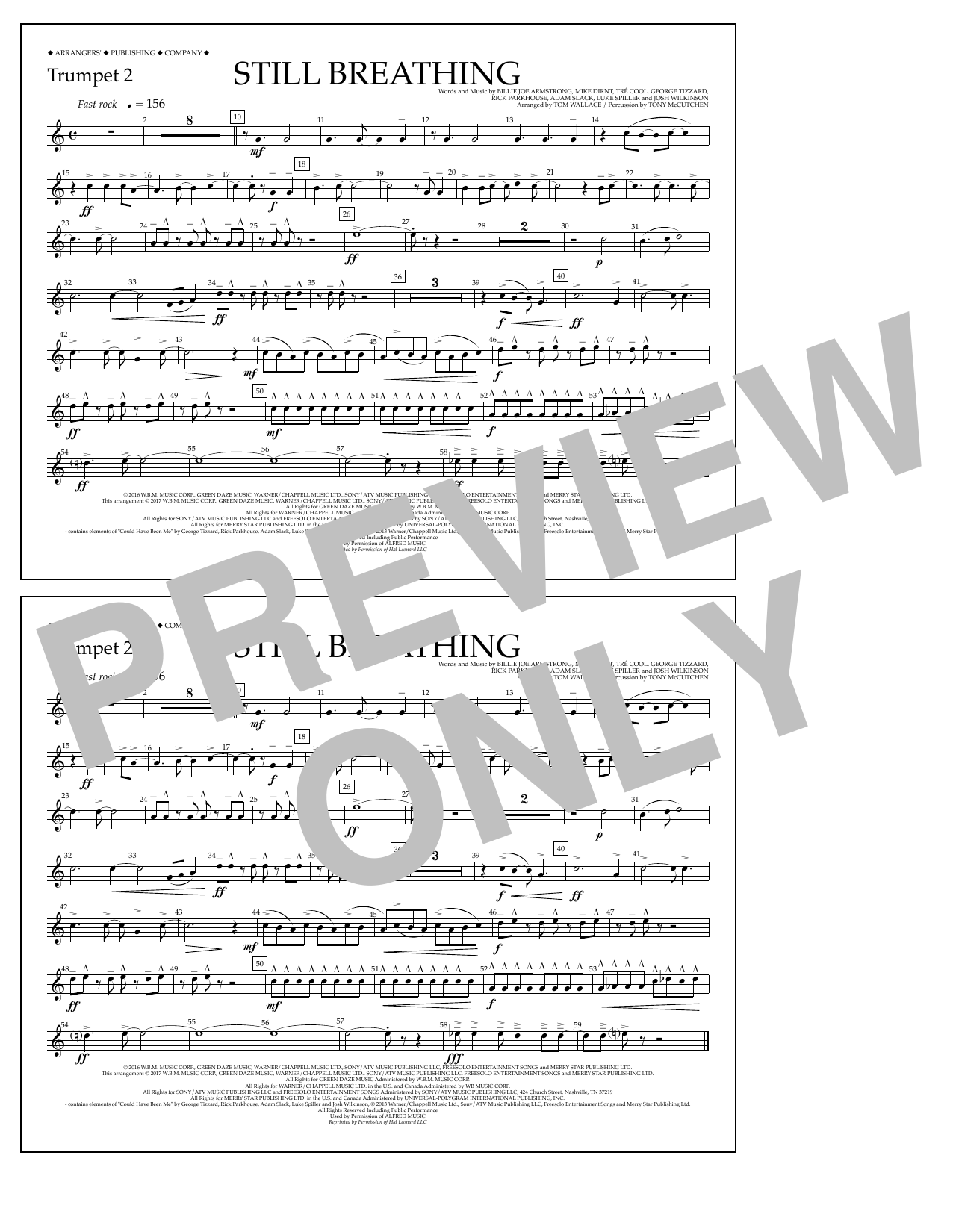 Download or print Tom Wallace Still Breathing - Trumpet 2 sheet music, chords and digital score arranged for Marching Band. This Pop score includes 1 page(s).