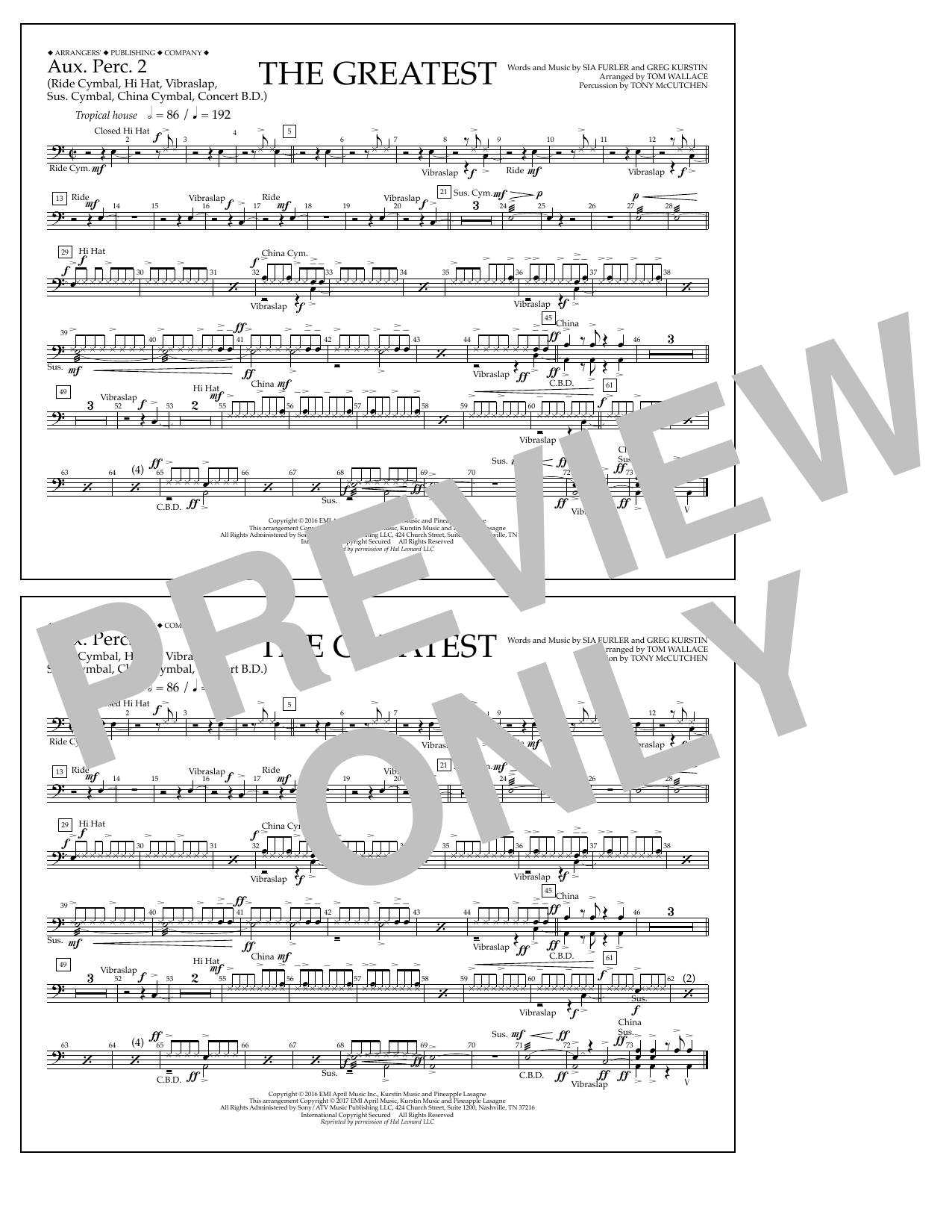 Download or print Tom Wallace The Greatest - Aux. Perc. 2 sheet music, chords and digital score arranged for Marching Band. This Pop score includes 1 page(s).