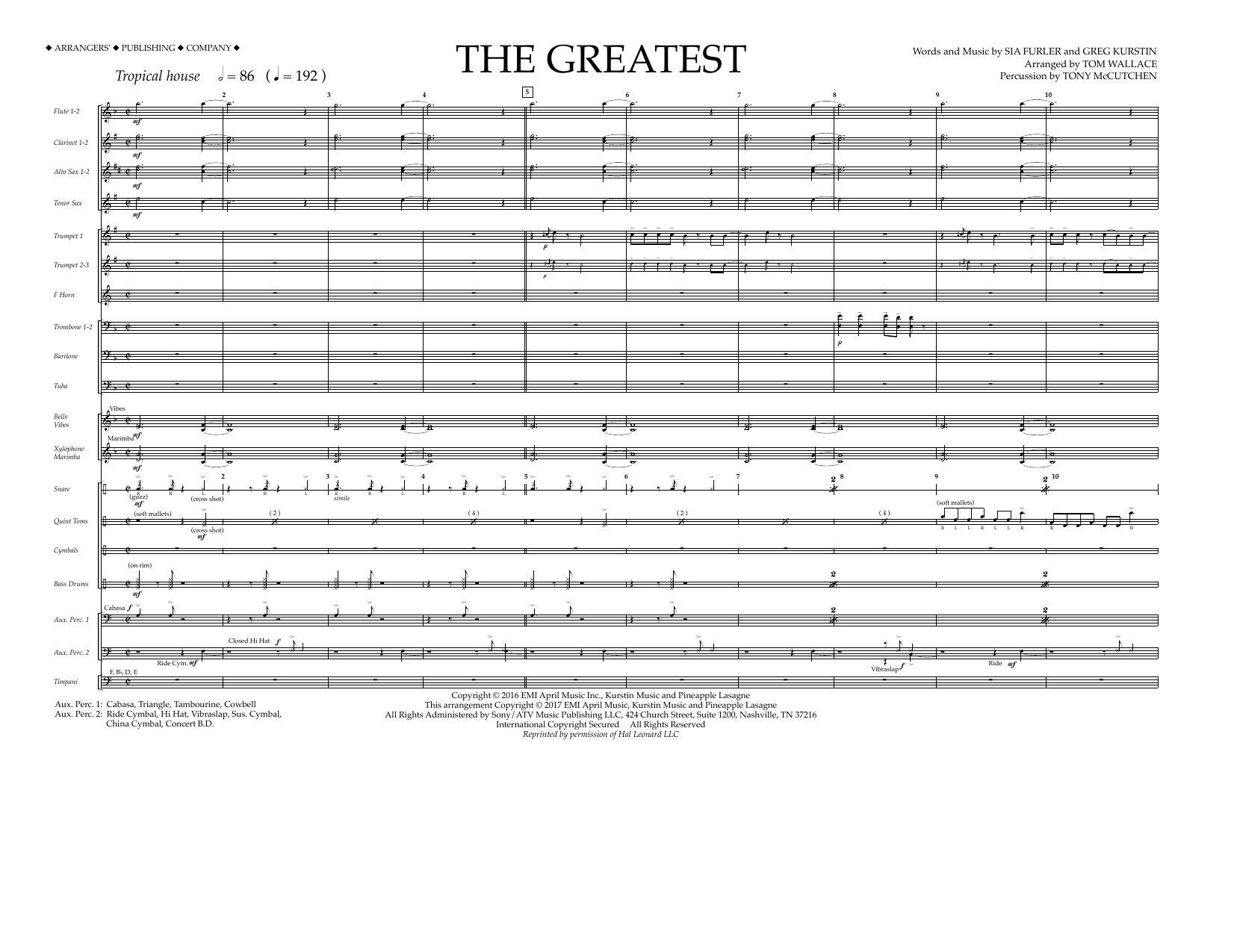 Download or print Tom Wallace The Greatest - Full Score sheet music, chords and digital score arranged for Marching Band. This Pop score includes 8 page(s).