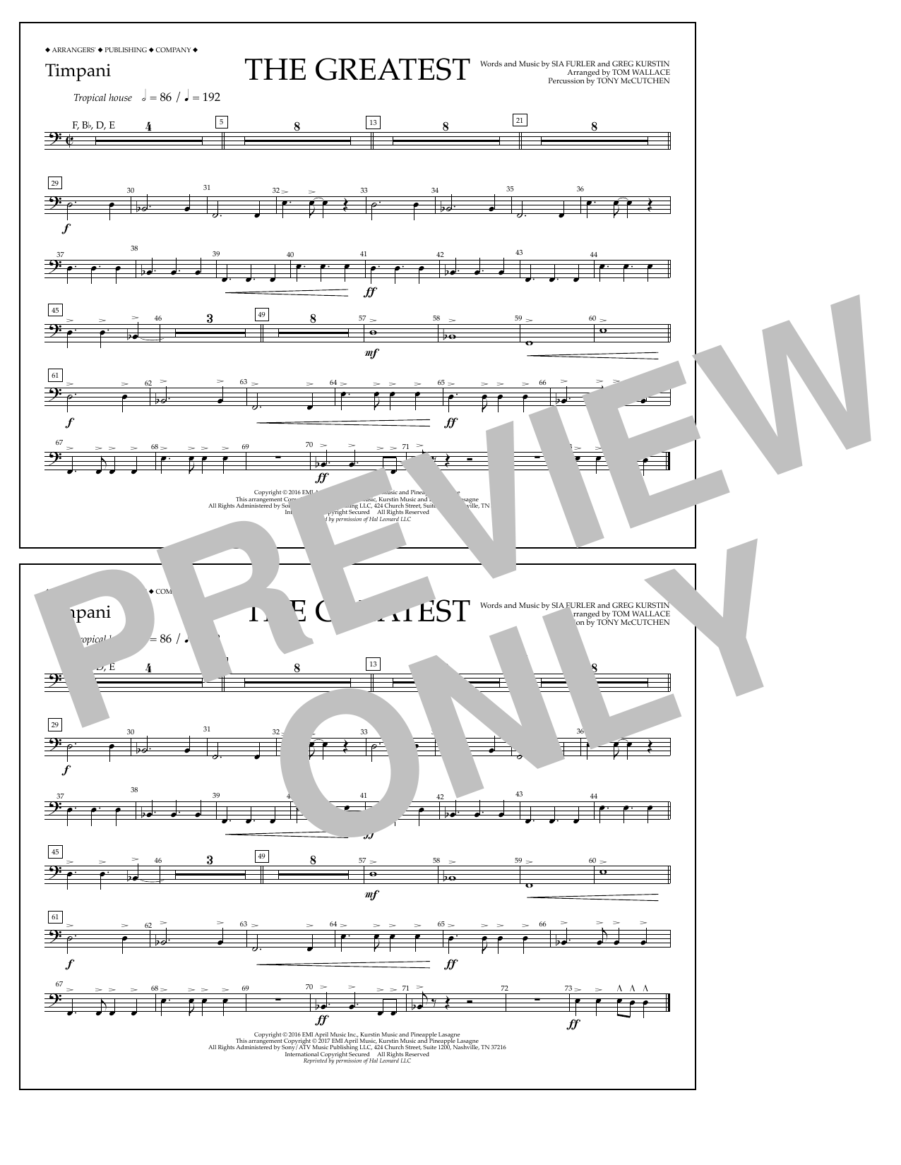 Download or print Tom Wallace The Greatest - Timpani sheet music, chords and digital score arranged for Marching Band. This Pop score includes 1 page(s).