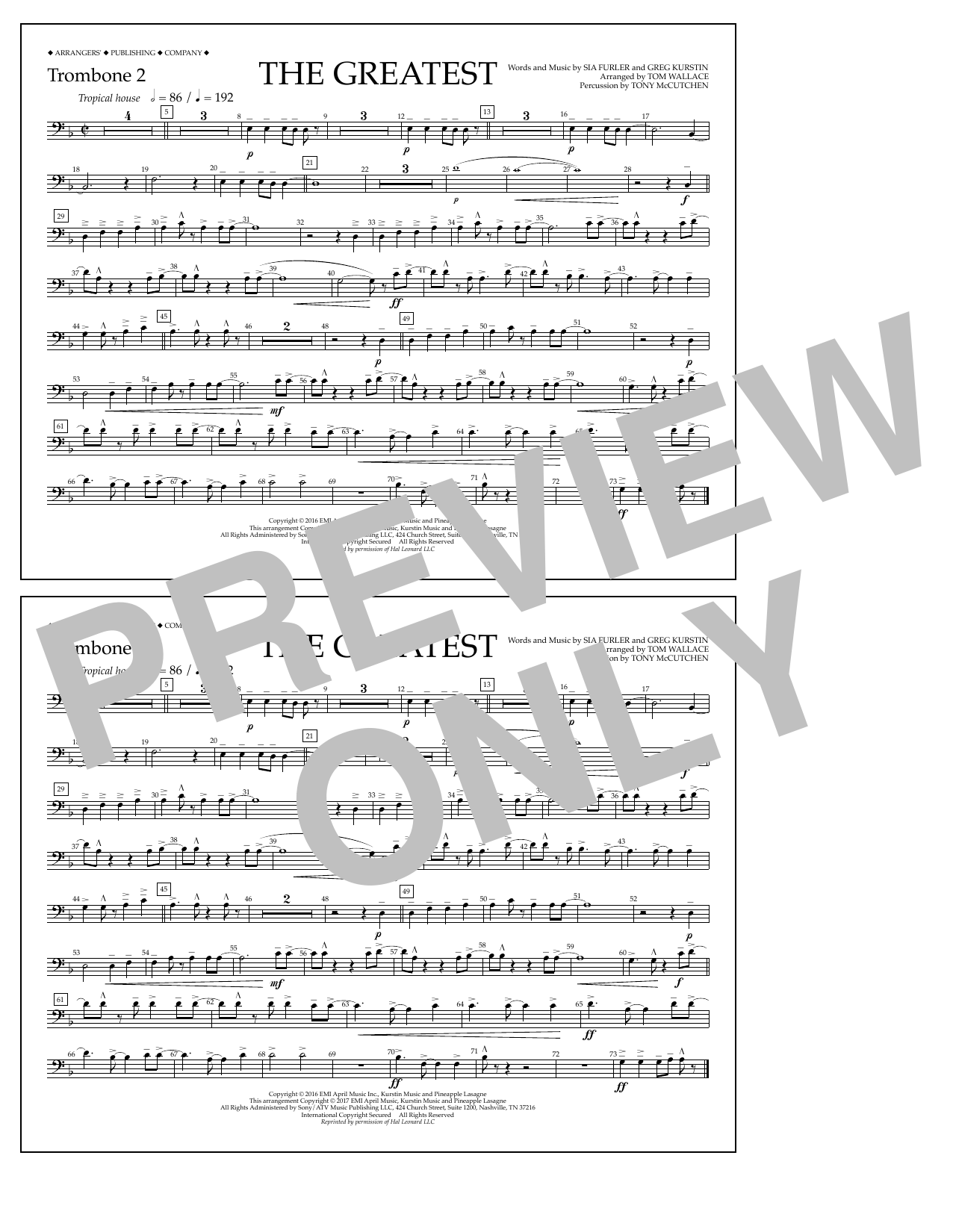 Download or print Tom Wallace The Greatest - Trombone 2 sheet music, chords and digital score arranged for Marching Band. This Pop score includes 1 page(s).
