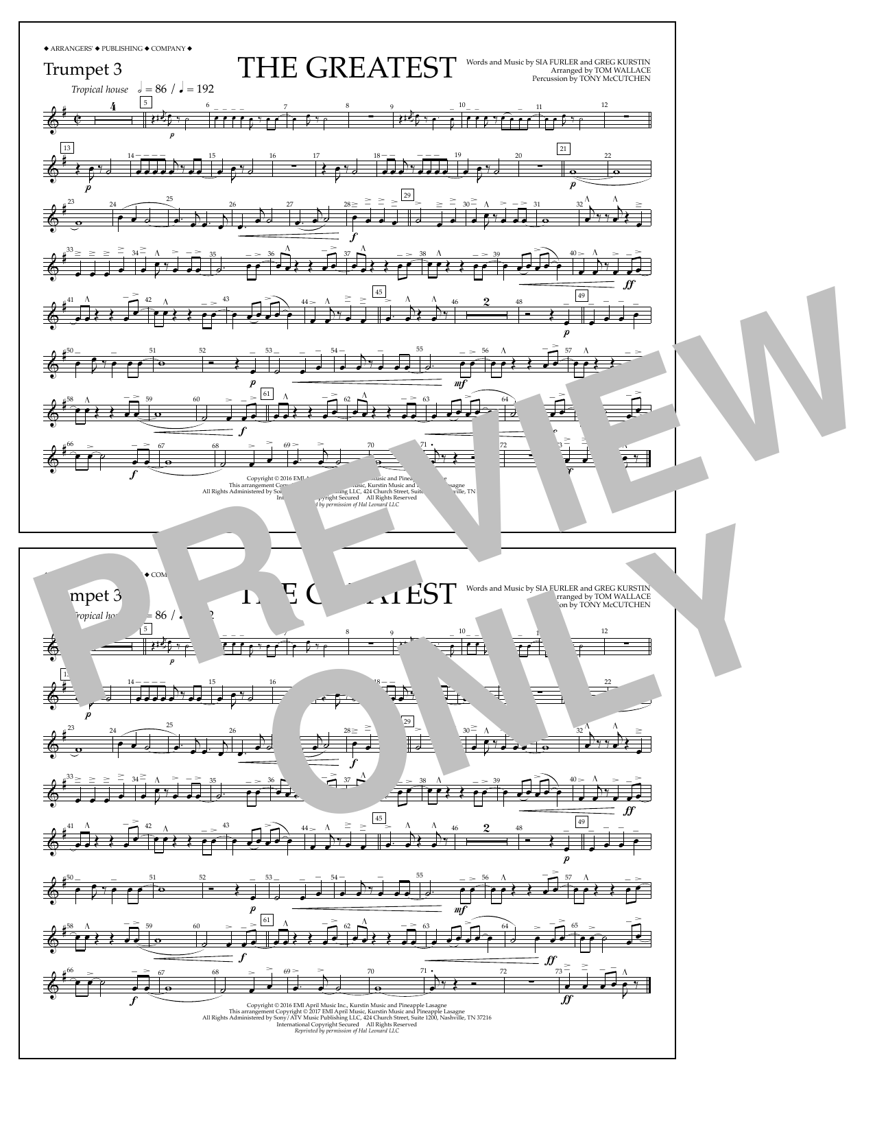 Download or print Tom Wallace The Greatest - Trumpet 3 sheet music, chords and digital score arranged for Marching Band. This Pop score includes 1 page(s).