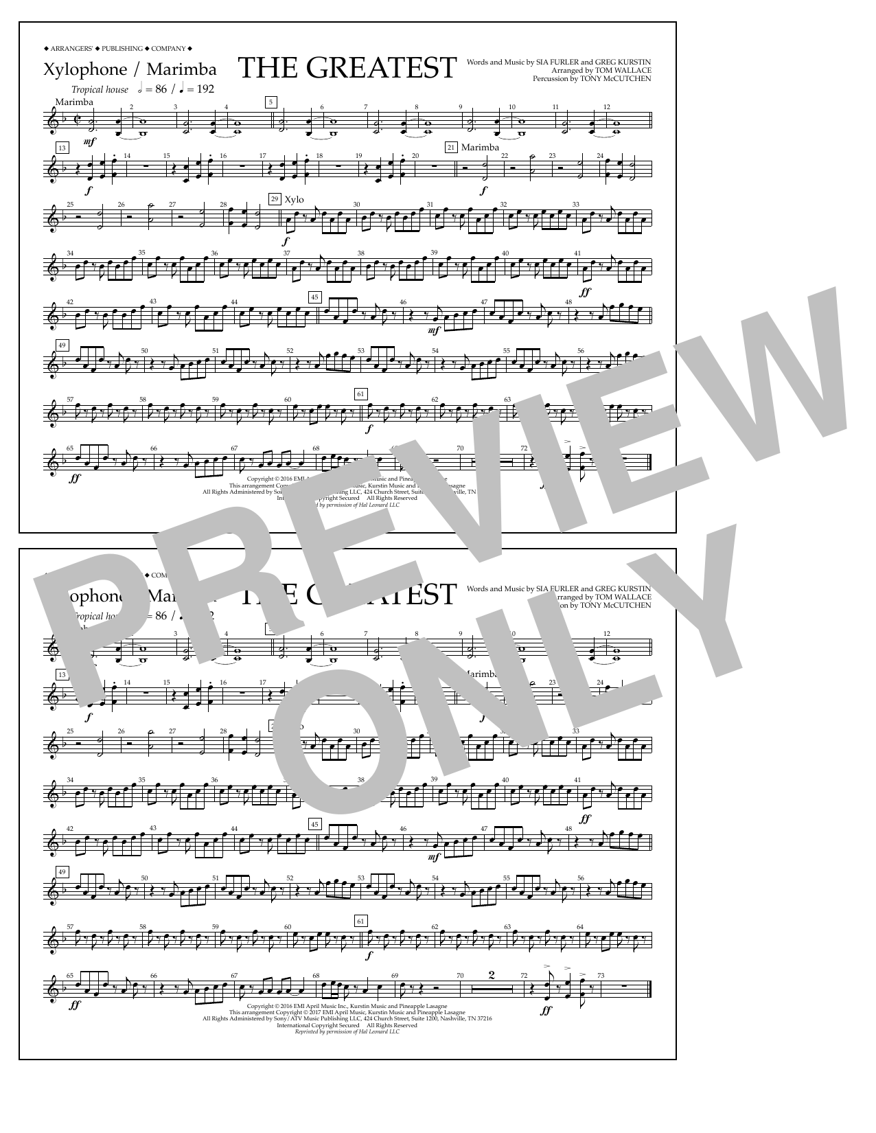Download or print Tom Wallace The Greatest - Xylophone/Marimba sheet music, chords and digital score arranged for Marching Band. This Pop score includes 1 page(s).