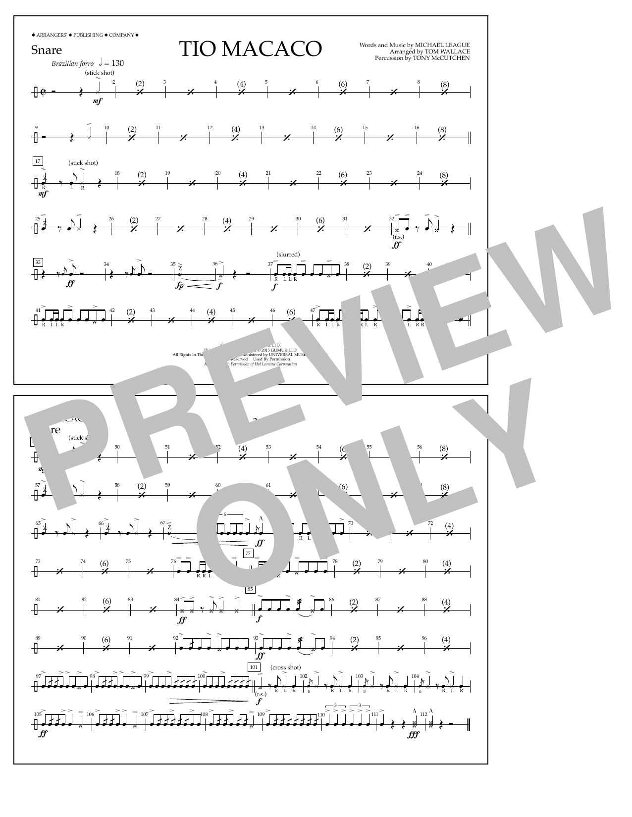Download or print Tom Wallace Tio Macaco - Snare sheet music, chords and digital score arranged for Marching Band. This Latin score includes 1 page(s).