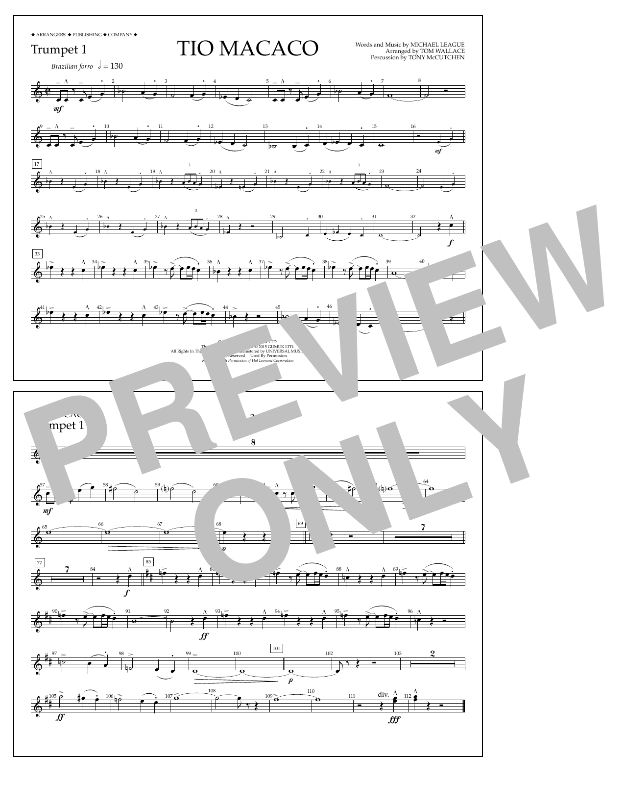 Download or print Tom Wallace Tio Macaco - Trumpet 1 sheet music, chords and digital score arranged for Marching Band. This Latin score includes 1 page(s).
