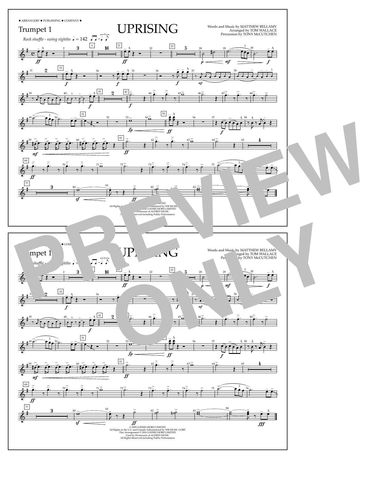 Download or print Tom Wallace Uprising - Trumpet 1 sheet music, chords and digital score arranged for Marching Band. This Pop score includes 1 page(s).