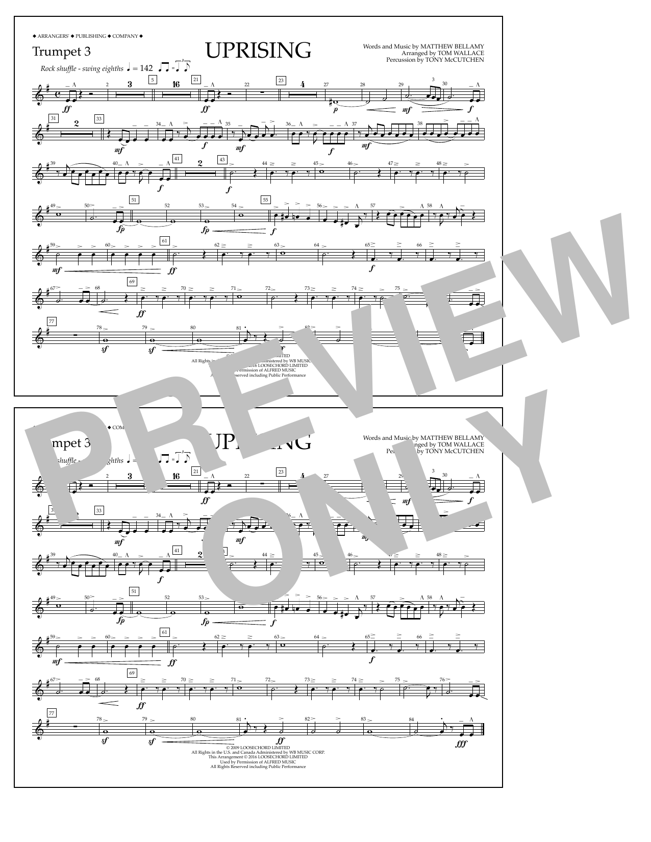 Download or print Tom Wallace Uprising - Trumpet 3 sheet music, chords and digital score arranged for Marching Band. This Pop score includes 1 page(s).