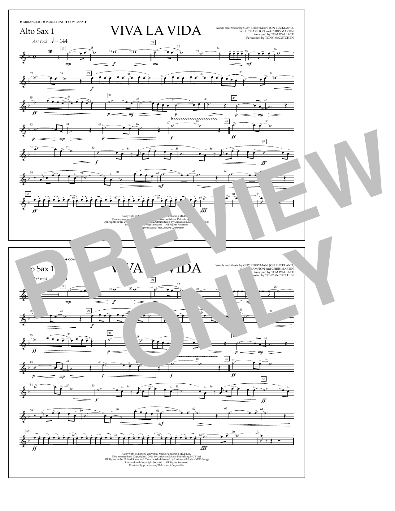 Download or print Tom Wallace Viva La Vida - Alto Sax 1 sheet music, chords and digital score arranged for Marching Band. This Pop score includes 1 page(s).