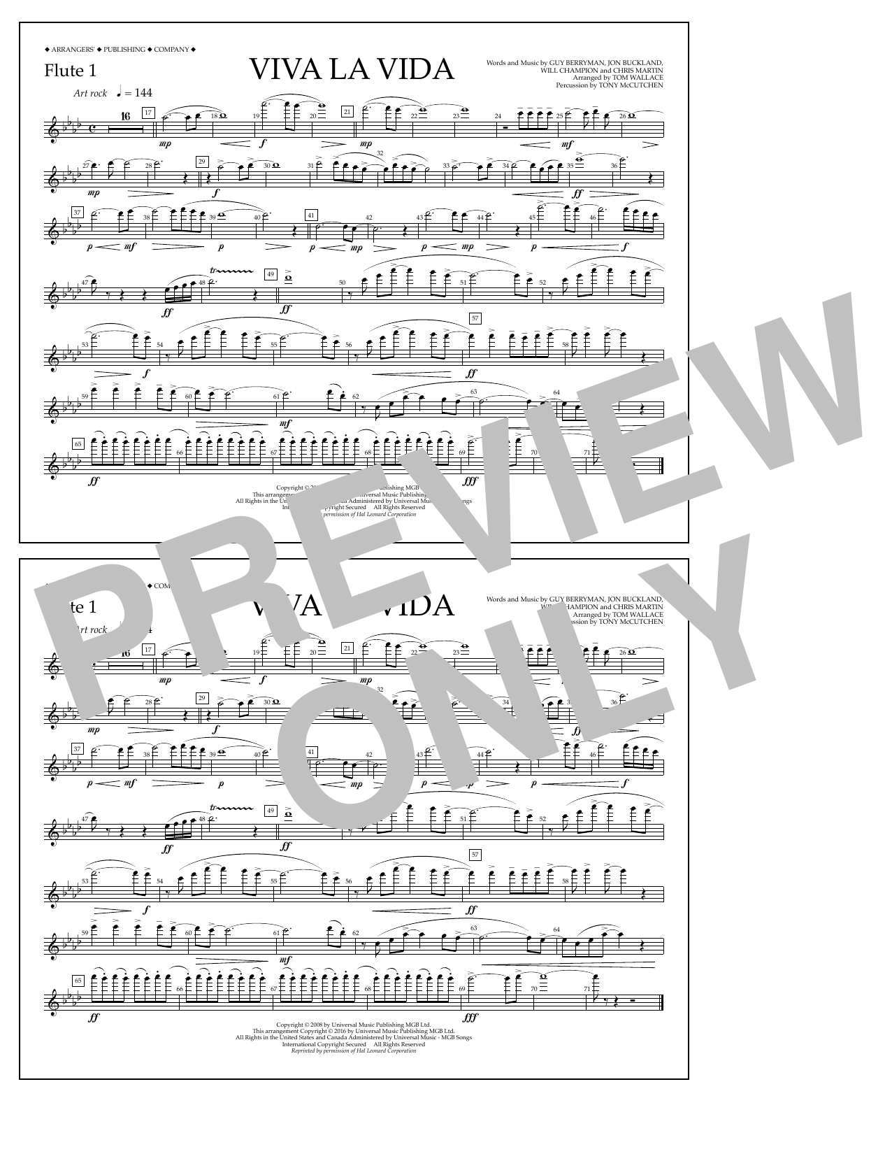 Download or print Tom Wallace Viva La Vida - Flute 1 sheet music, chords and digital score arranged for Marching Band. This Pop score includes 1 page(s).