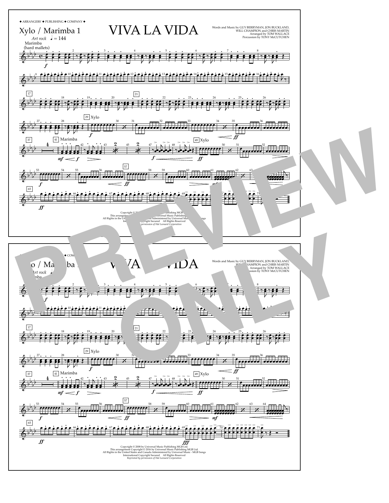 Download or print Tom Wallace Viva La Vida - Xylo./Marimba 1 sheet music, chords and digital score arranged for Marching Band. This Pop score includes 1 page(s).