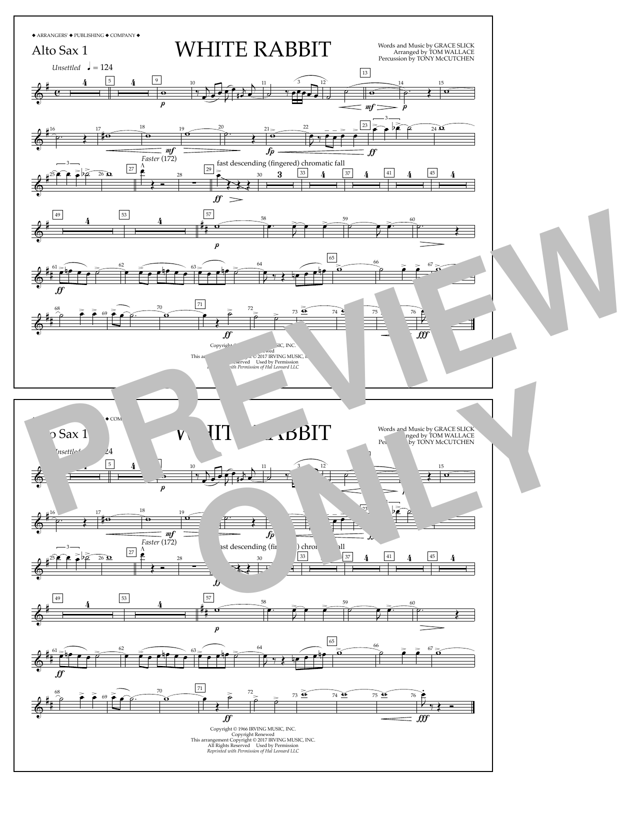 Download or print Tom Wallace White Rabbit - Alto Sax 1 sheet music, chords and digital score arranged for Marching Band. This Pop score includes 1 page(s).