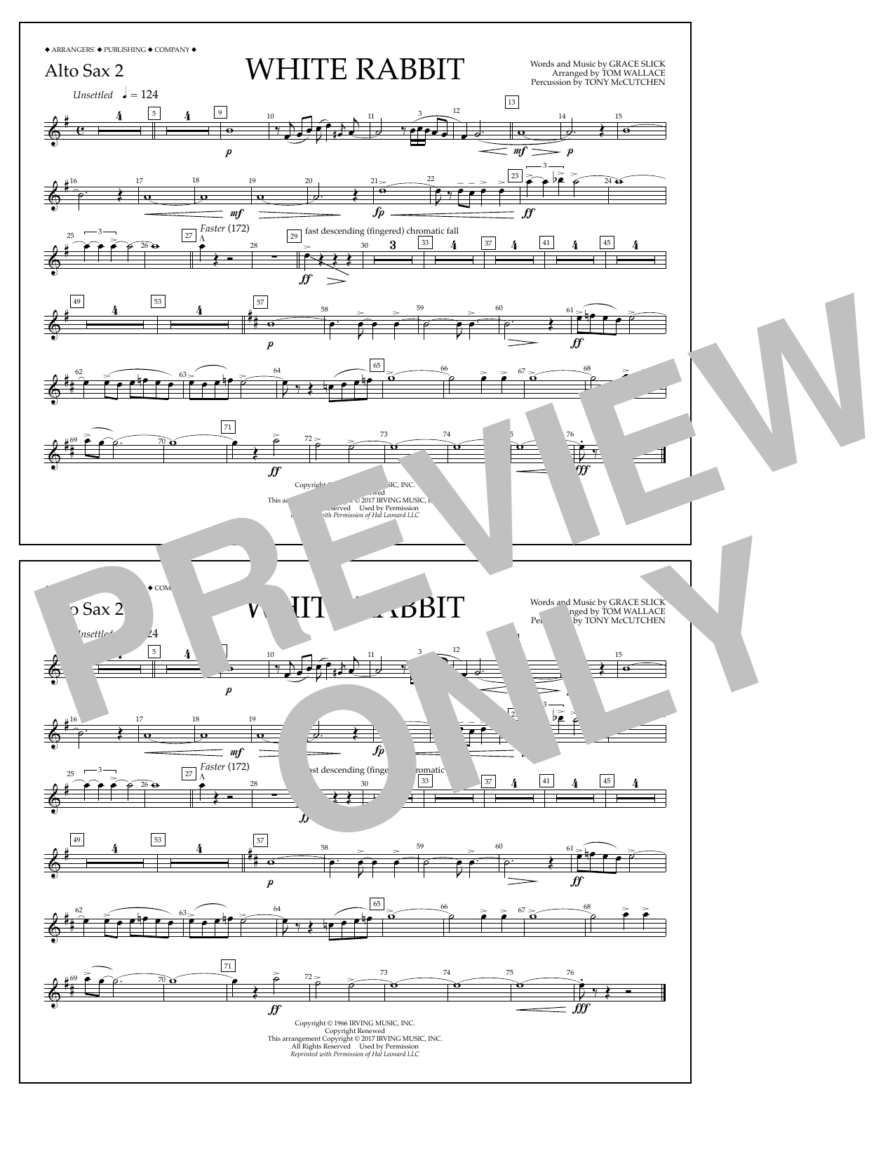 Download or print Tom Wallace White Rabbit - Alto Sax 2 sheet music, chords and digital score arranged for Marching Band. This Pop score includes 1 page(s).