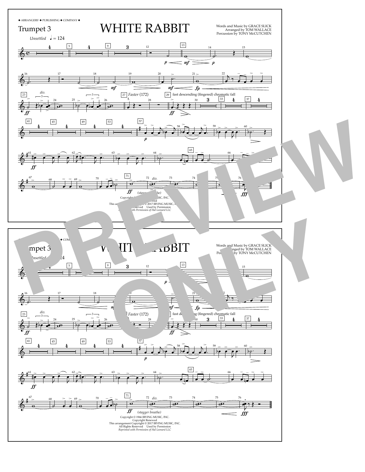 Download or print Tom Wallace White Rabbit - Trumpet 3 sheet music, chords and digital score arranged for Marching Band. This Pop score includes 1 page(s).