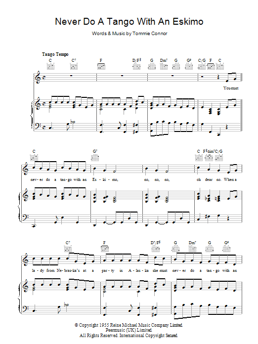 Download or print Tommie Connor Never Do A Tango With An Eskimo sheet music, chords and digital score arranged for Piano, Vocal & Guitar Chords. This Pop score includes 3 page(s).
