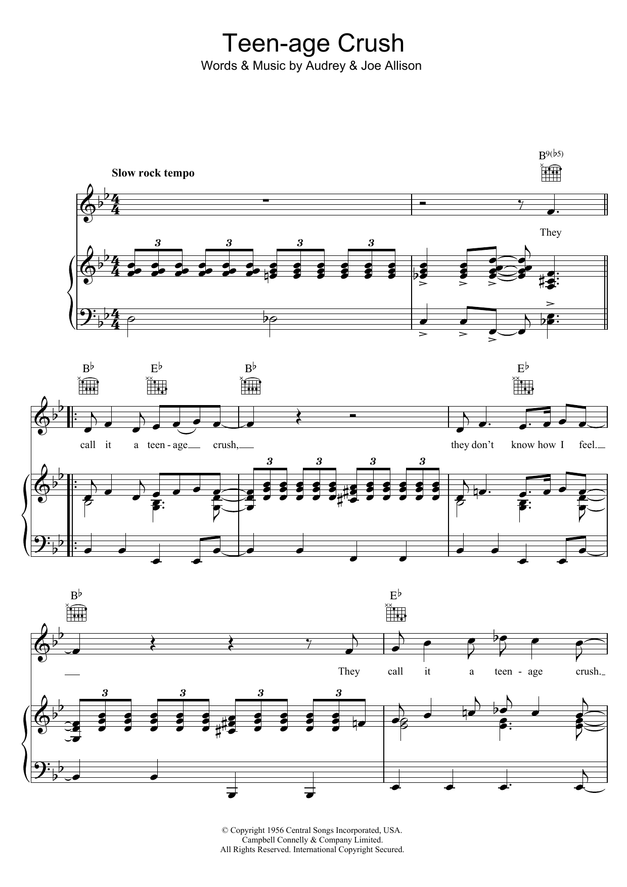 Download or print Tommie Sands Teen-Age Crush sheet music, chords and digital score arranged for Piano, Vocal & Guitar Chords. This Pop score includes 3 page(s).