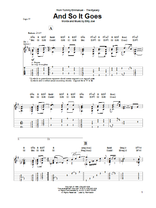 Download or print Tommy Emmanuel And So It Goes sheet music, chords and digital score arranged for Solo Guitar. This Pop score includes 4 page(s).