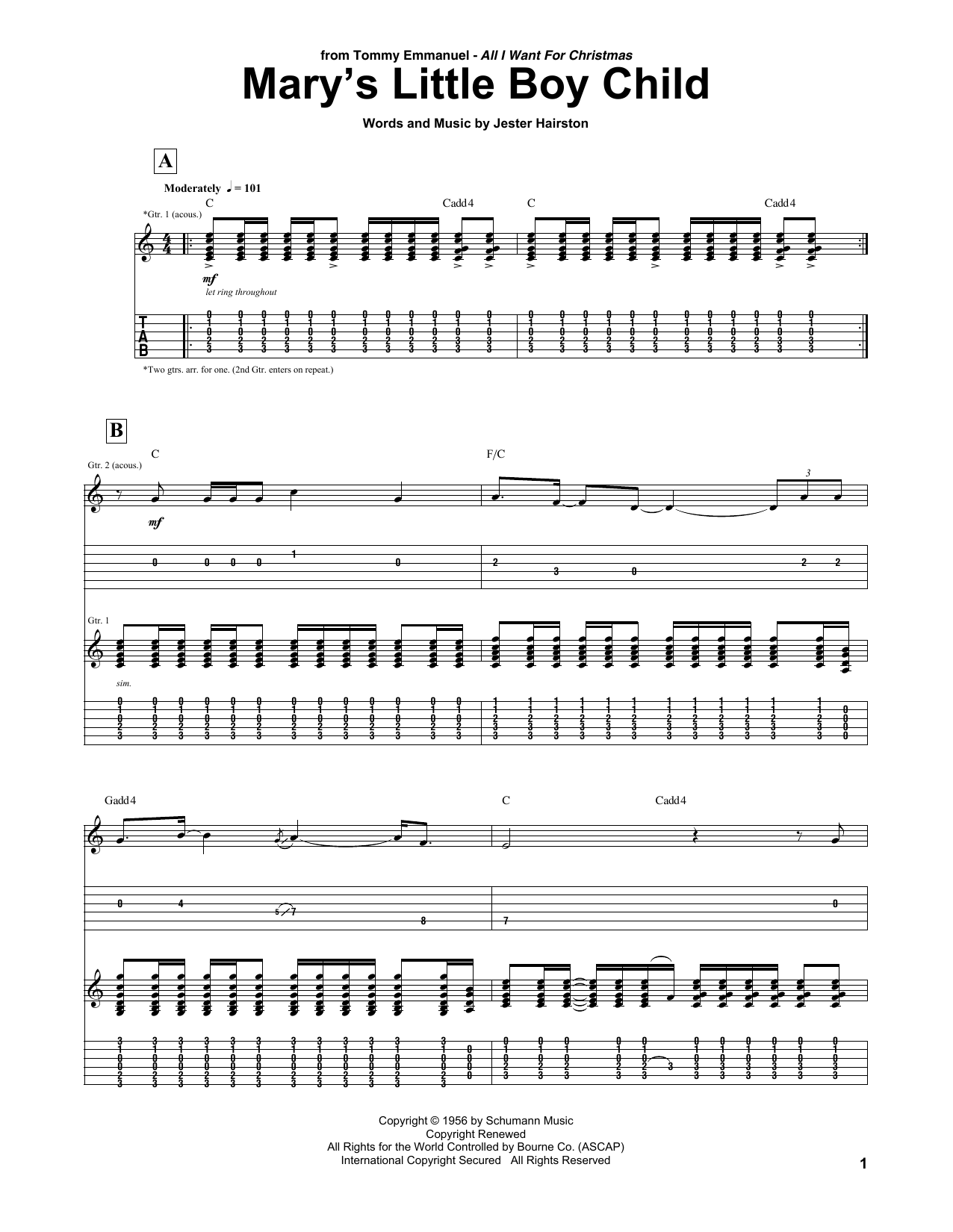 Download or print Tommy Emmanuel Mary's Little Boy Child sheet music, chords and digital score arranged for Guitar Tab. This Christmas score includes 12 page(s).