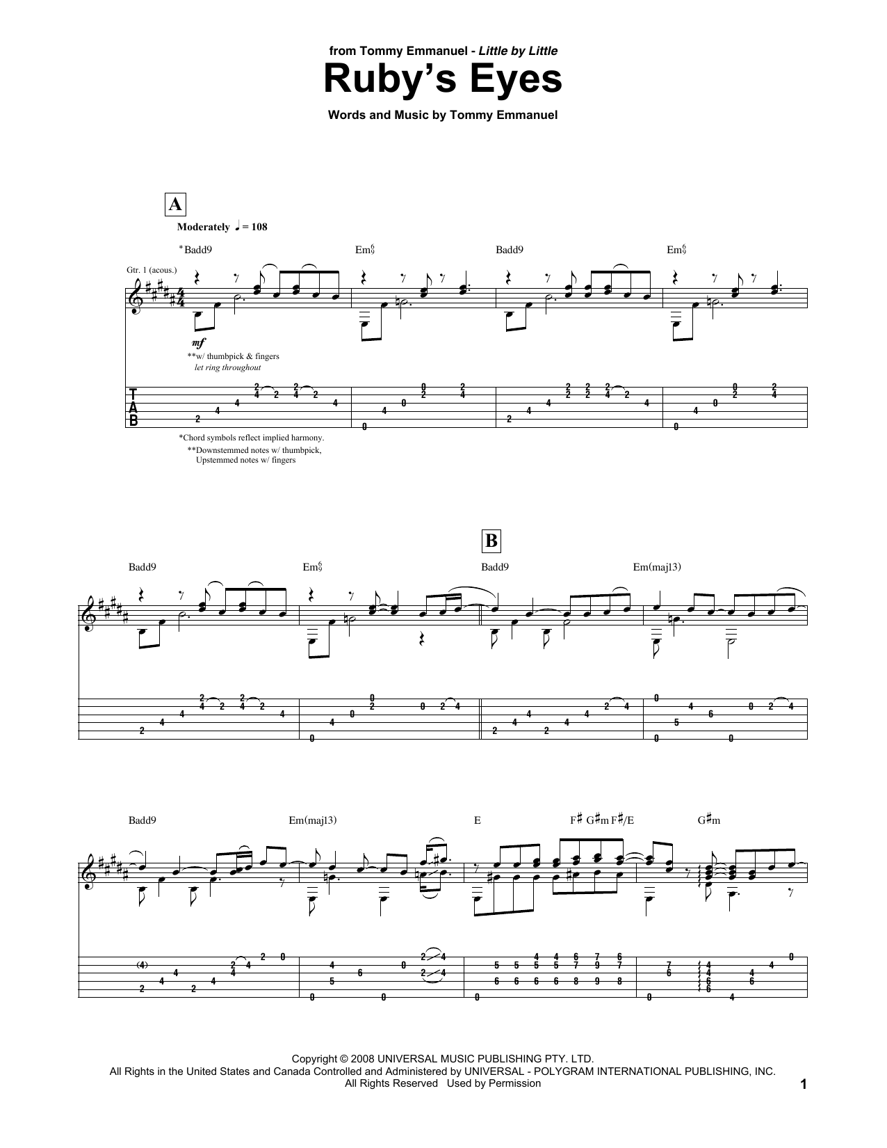 Download or print Tommy Emmanuel Ruby's Eyes sheet music, chords and digital score arranged for Guitar Tab. This Pop score includes 6 page(s).
