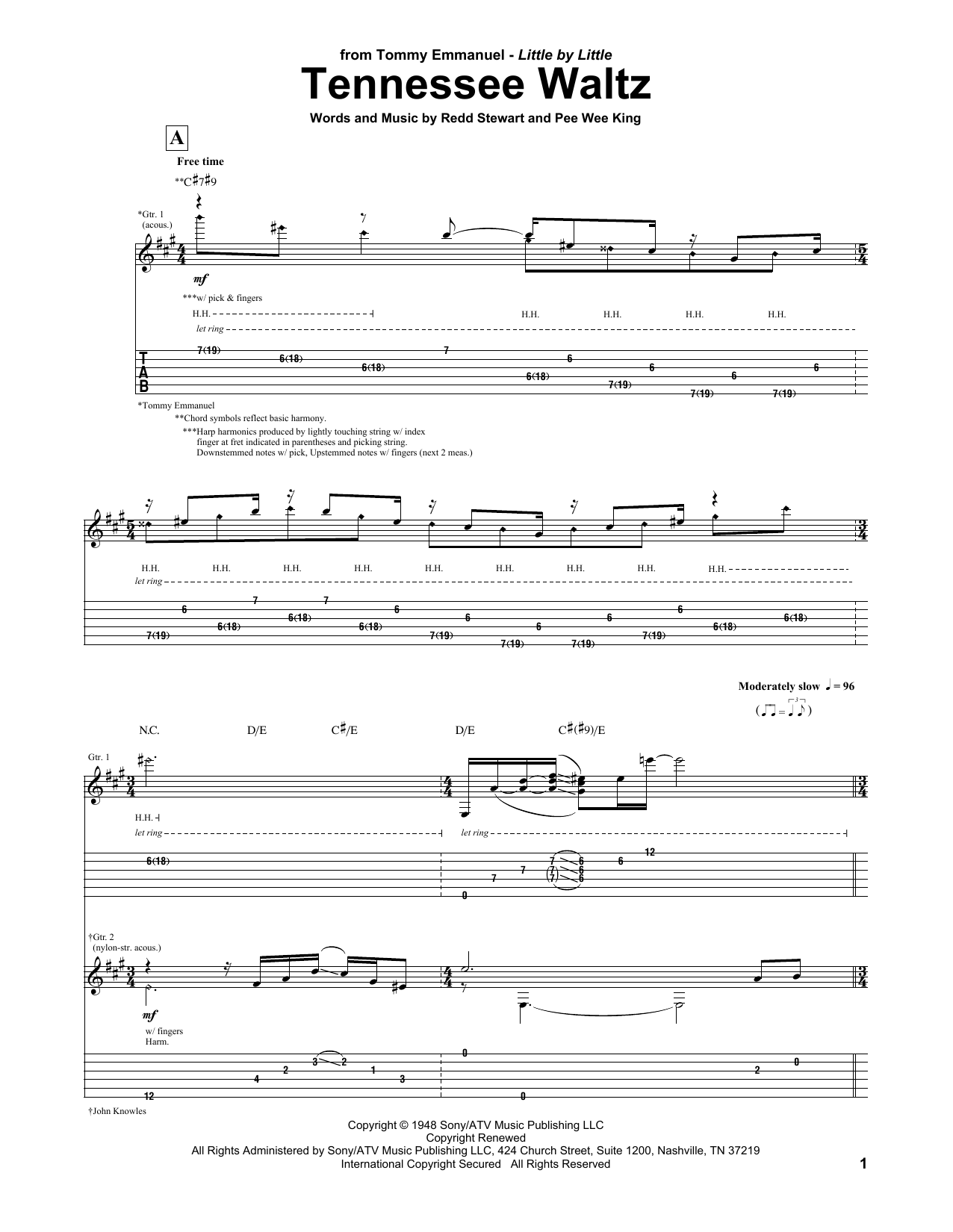 Download or print Tommy Emmanuel Tennessee Waltz sheet music, chords and digital score arranged for Guitar Tab. This Jazz score includes 9 page(s).